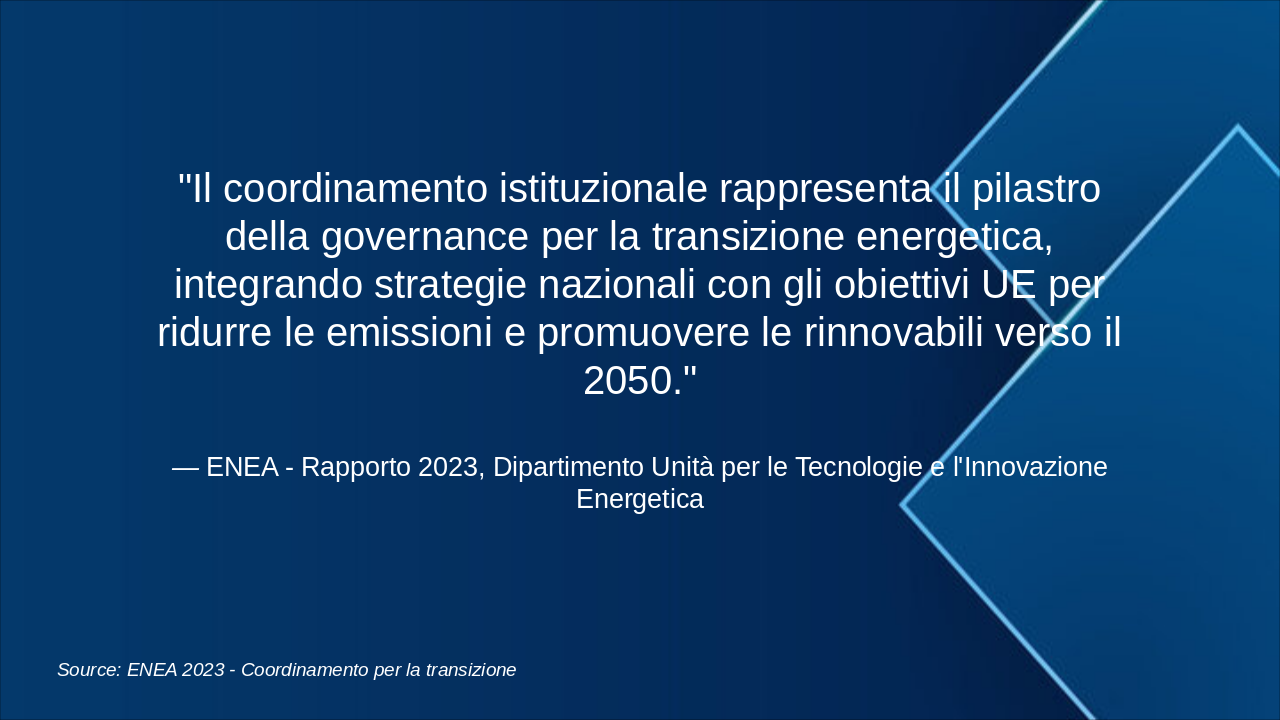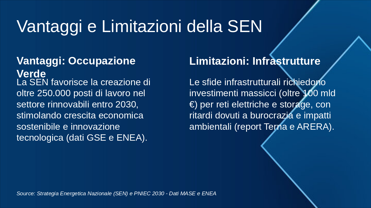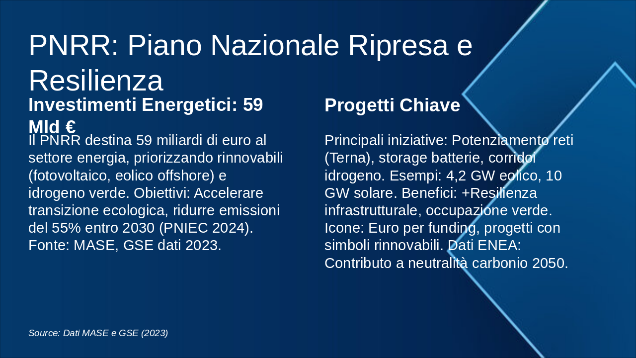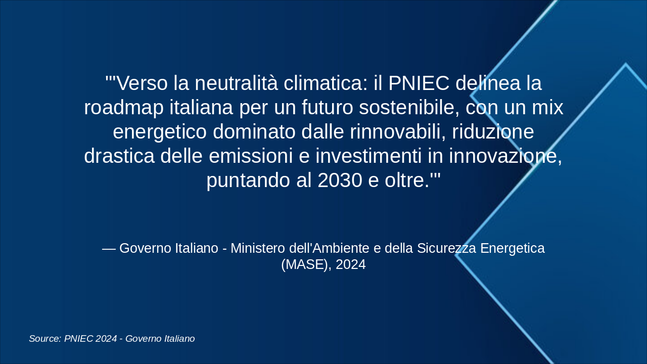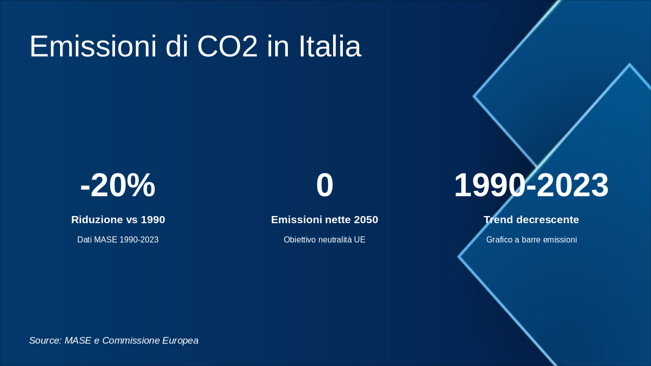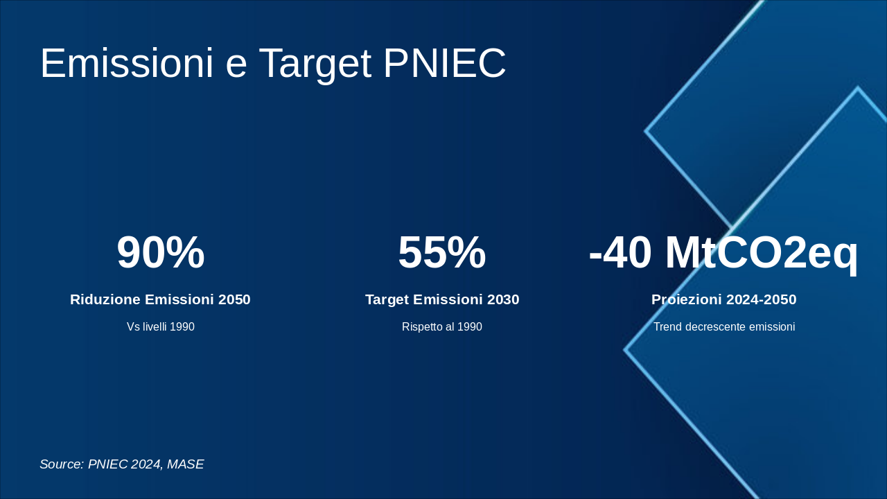 Questa slide illustra la roadmap energetica italiana verso il 2050, con milestones chiave per decarbonizzazione. Enfatizzare il grafico progressivo del mix energetico e riduzione emissioni. Usare icone rinnovabili (sole, vento) e barre per obiettivi. Contestualizzare con SEN e PNIEC: 2030 focus su rinnovabili 30%, efficienza; 2040 intermedi verso neutralità; 2050 zero emissioni nette. Citare MASE per dati ufficiali. Durata discussione: 5-7 min.