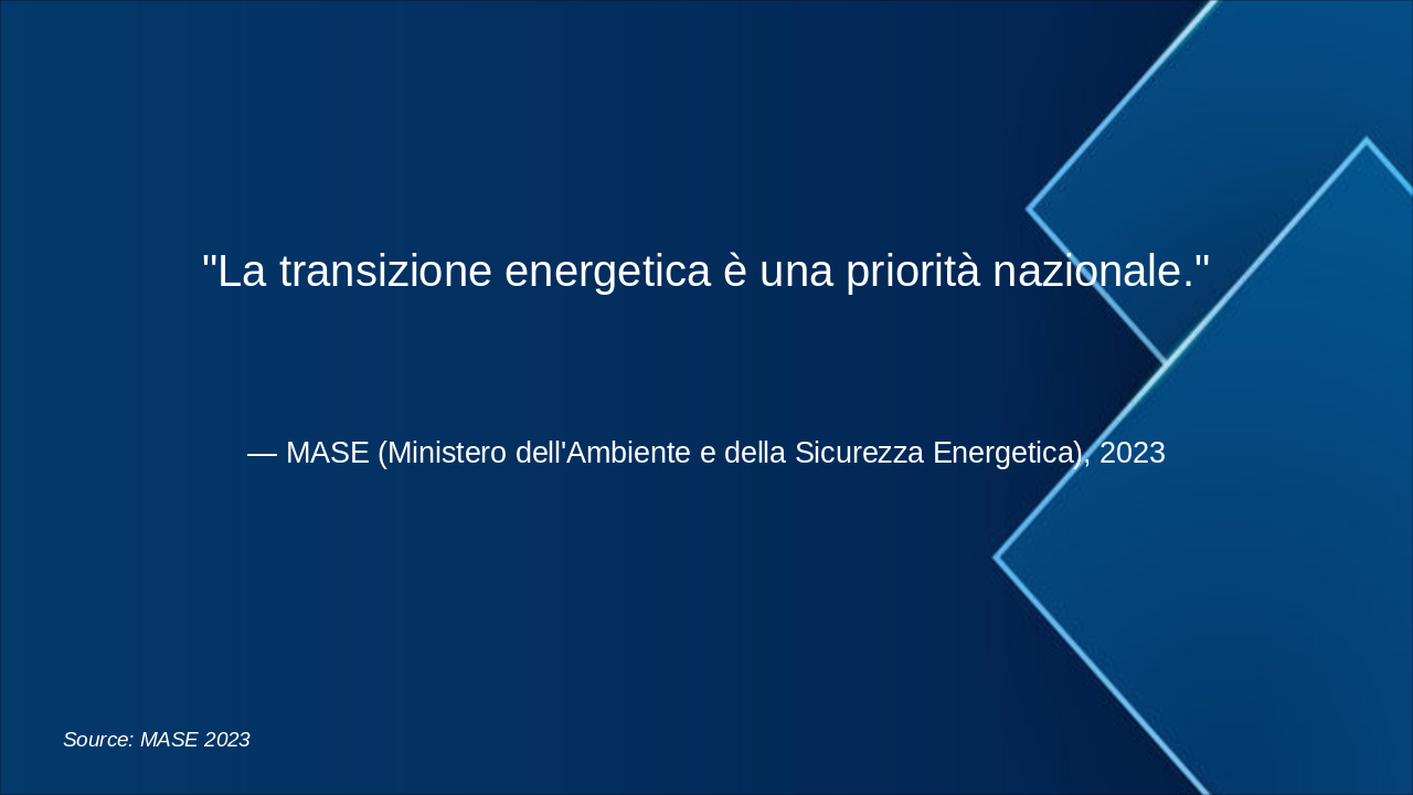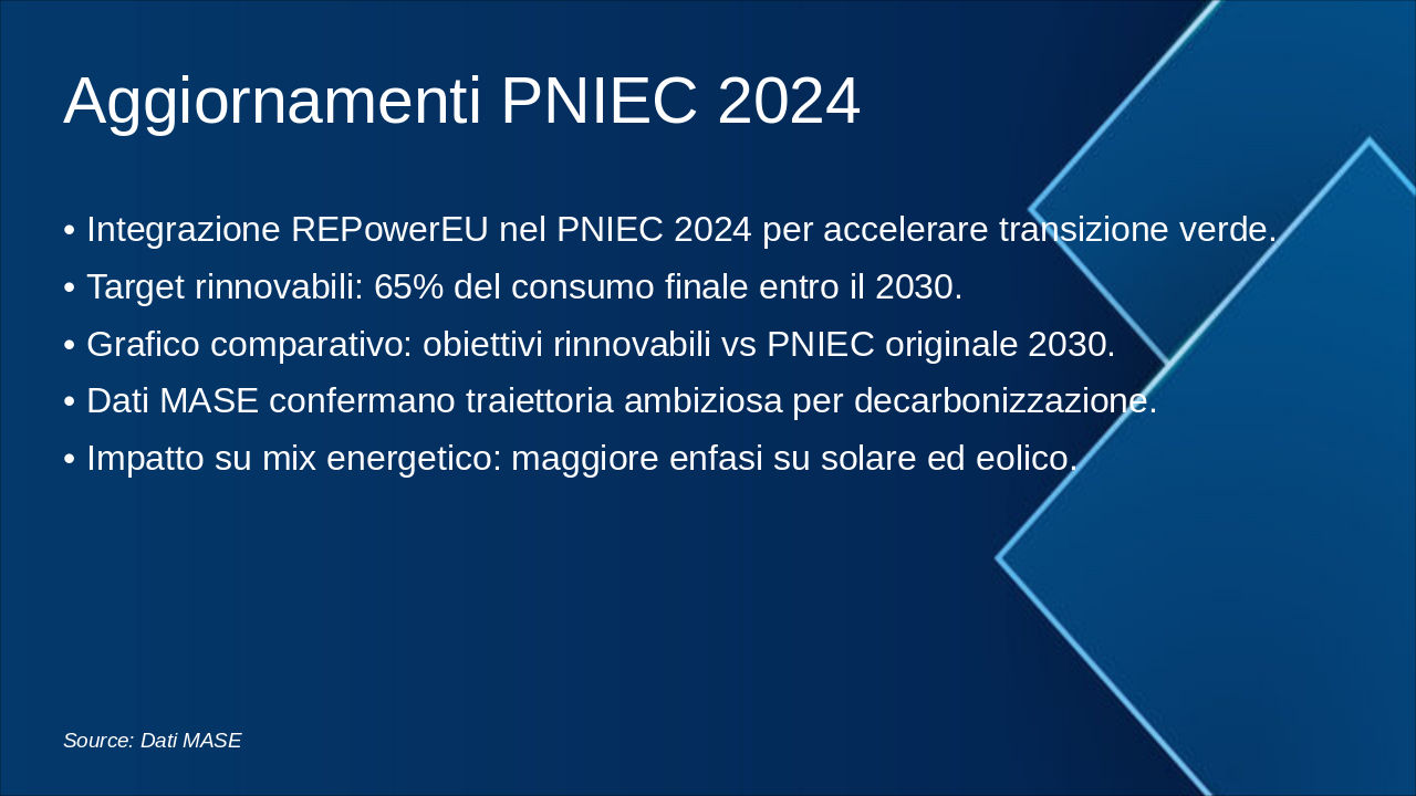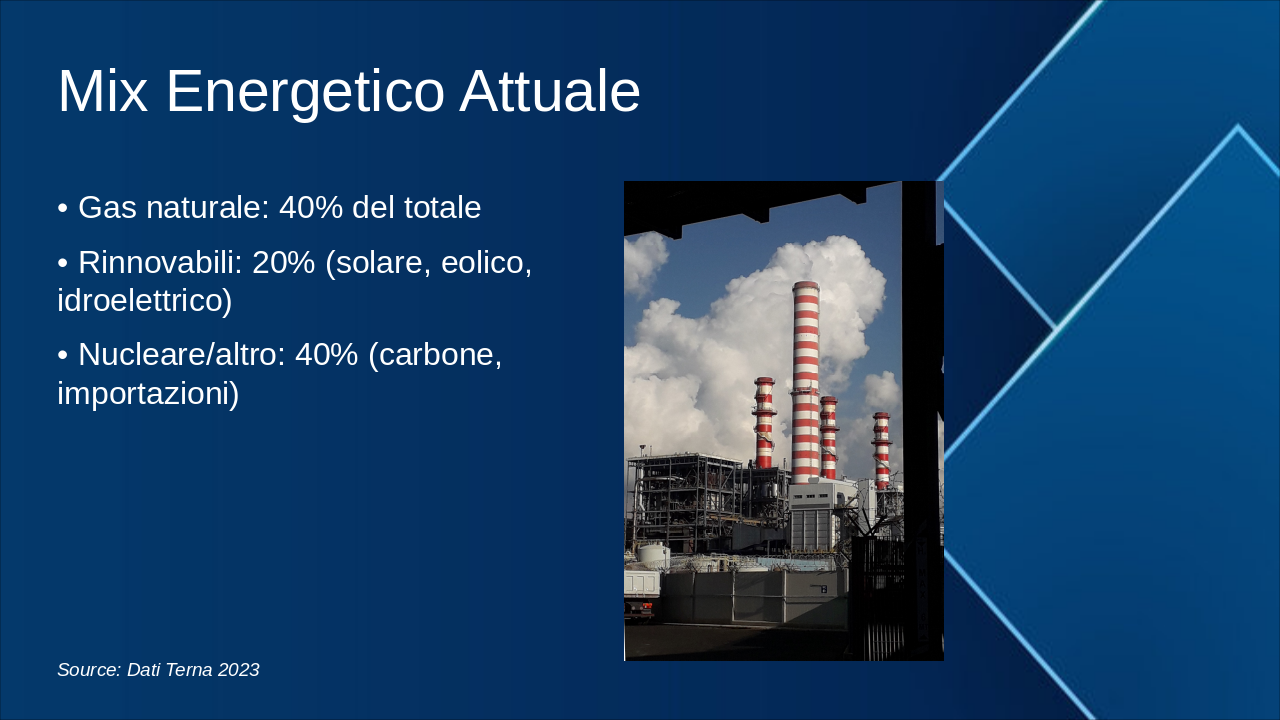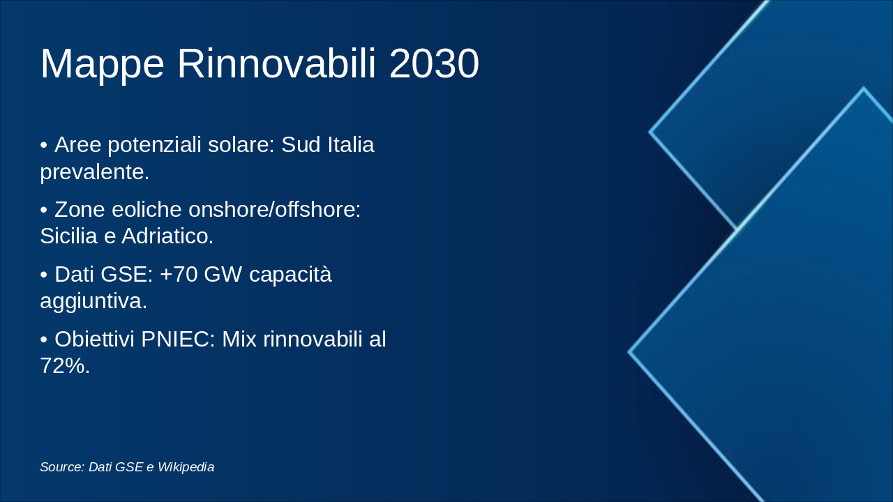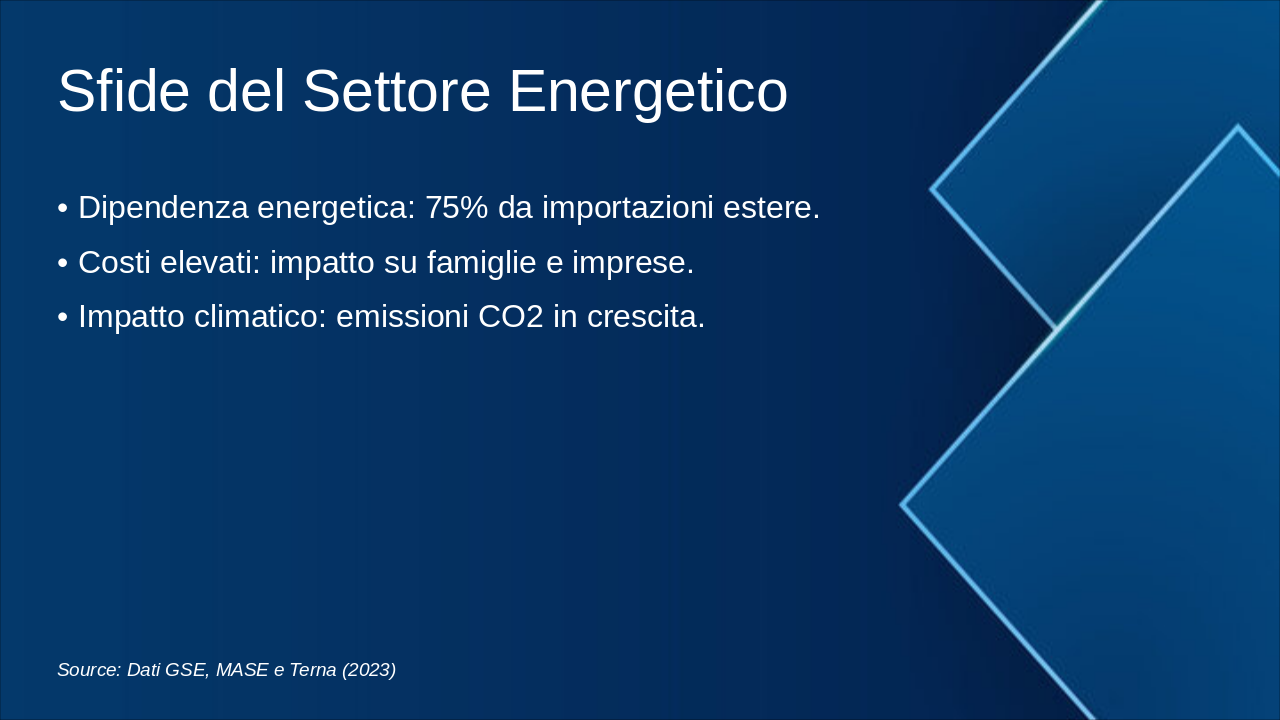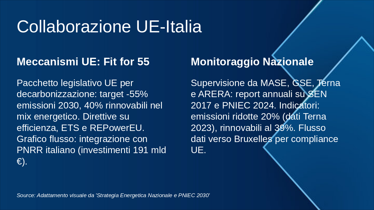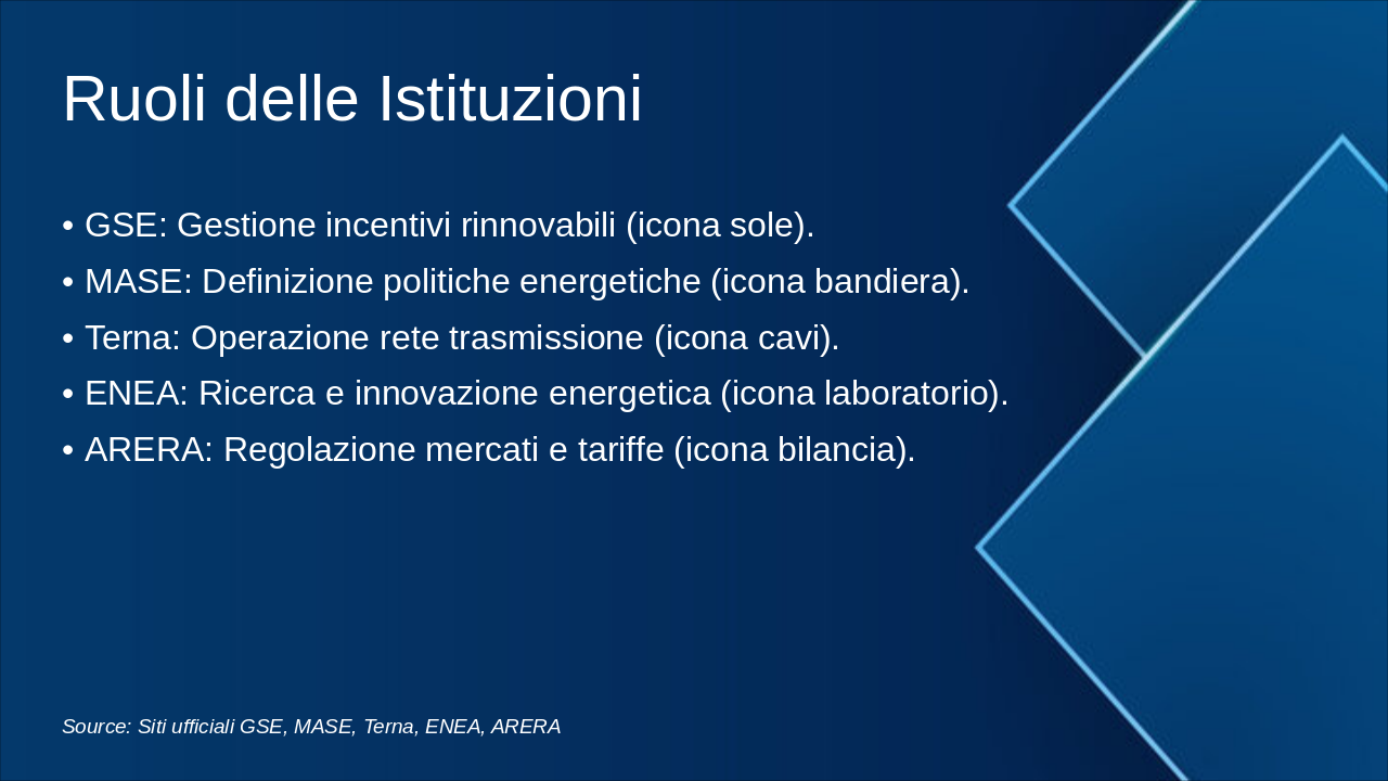 Questa slide illustra la roadmap energetica italiana verso il 2050, con milestones chiave per decarbonizzazione. Enfatizzare il grafico progressivo del mix energetico e riduzione emissioni. Usare icone rinnovabili (sole, vento) e barre per obiettivi. Contestualizzare con SEN e PNIEC: 2030 focus su rinnovabili 30%, efficienza; 2040 intermedi verso neutralità; 2050 zero emissioni nette. Citare MASE per dati ufficiali. Durata discussione: 5-7 min.