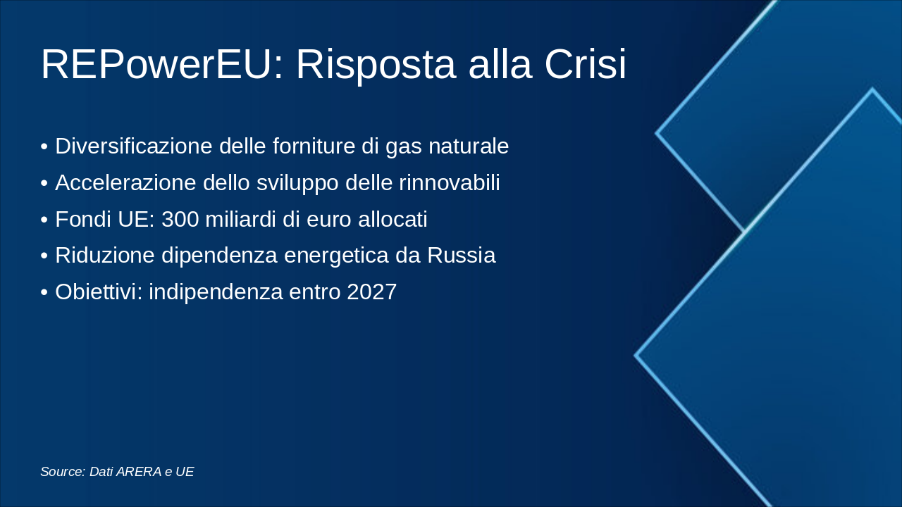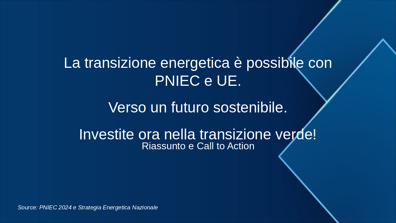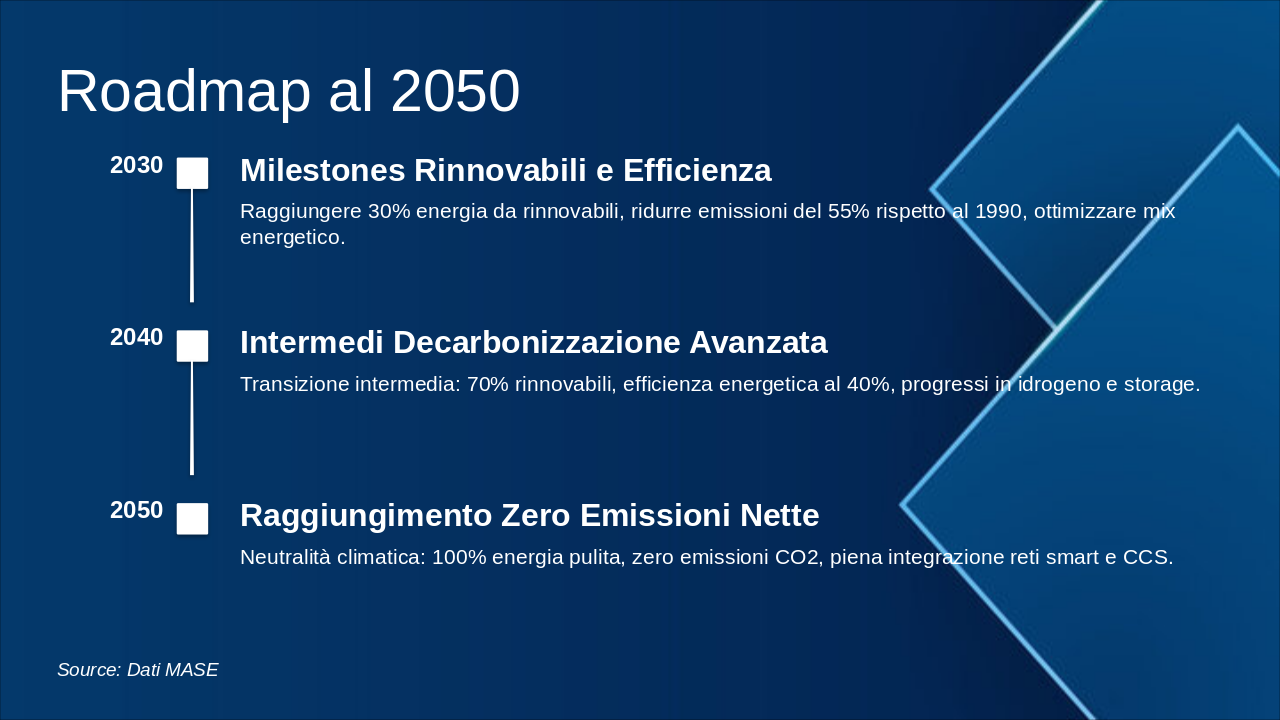 2030: Milestones Rinnovabili e Efficienza Raggiungere 30% energia da rinnovabili, ridurre emissioni del 55% rispetto al 1990, ottimizzare mix energetico. 2040: Intermedi Decarbonizzazione Avanzata Transizione intermedia: 70% rinnovabili, efficienza energetica al 40%, progressi in idrogeno e storage. 2050: Raggiungimento Zero Emissioni Nette Neutralità climatica: 100% energia pulita, zero emissioni CO2, piena integrazione reti smart e CCS.