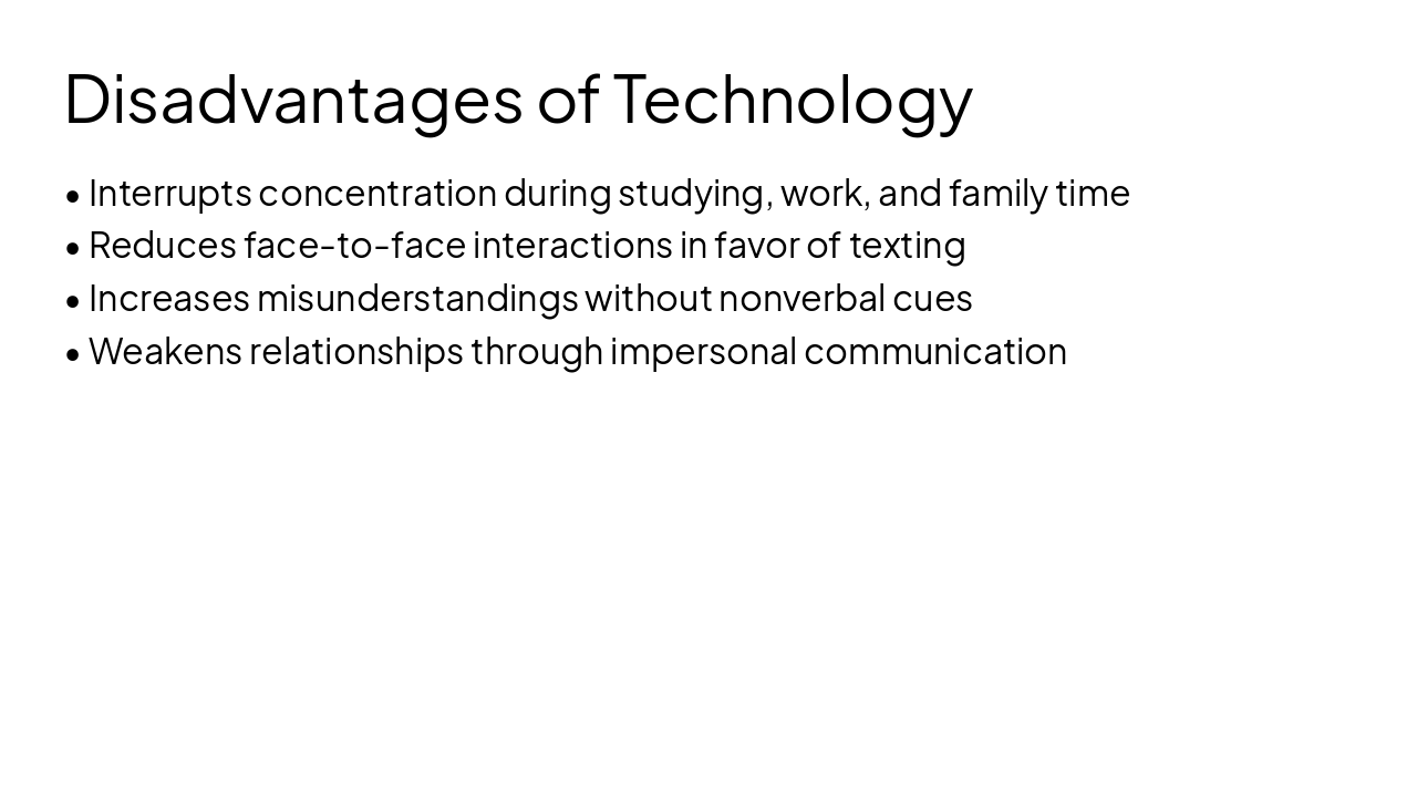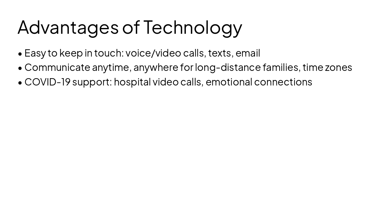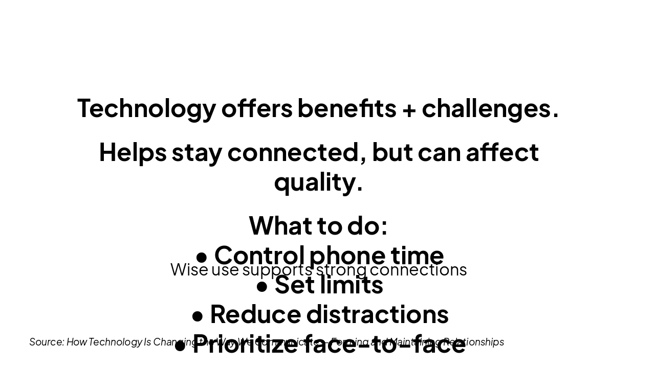 Technology offers benefits like staying connected but poses challenges to relationship quality. To foster healthy relationships, control phone time, set limits, reduce distractions, prioritize face-to-face interactions, and use technology wisely.