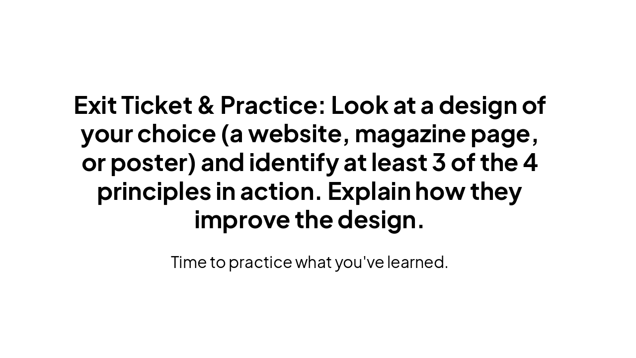 Exit Ticket & Practice: Look at a design of your choice (a website, magazine page, or poster) and identify at least 3 of the 4 principles in action. Explain how they improve the design.