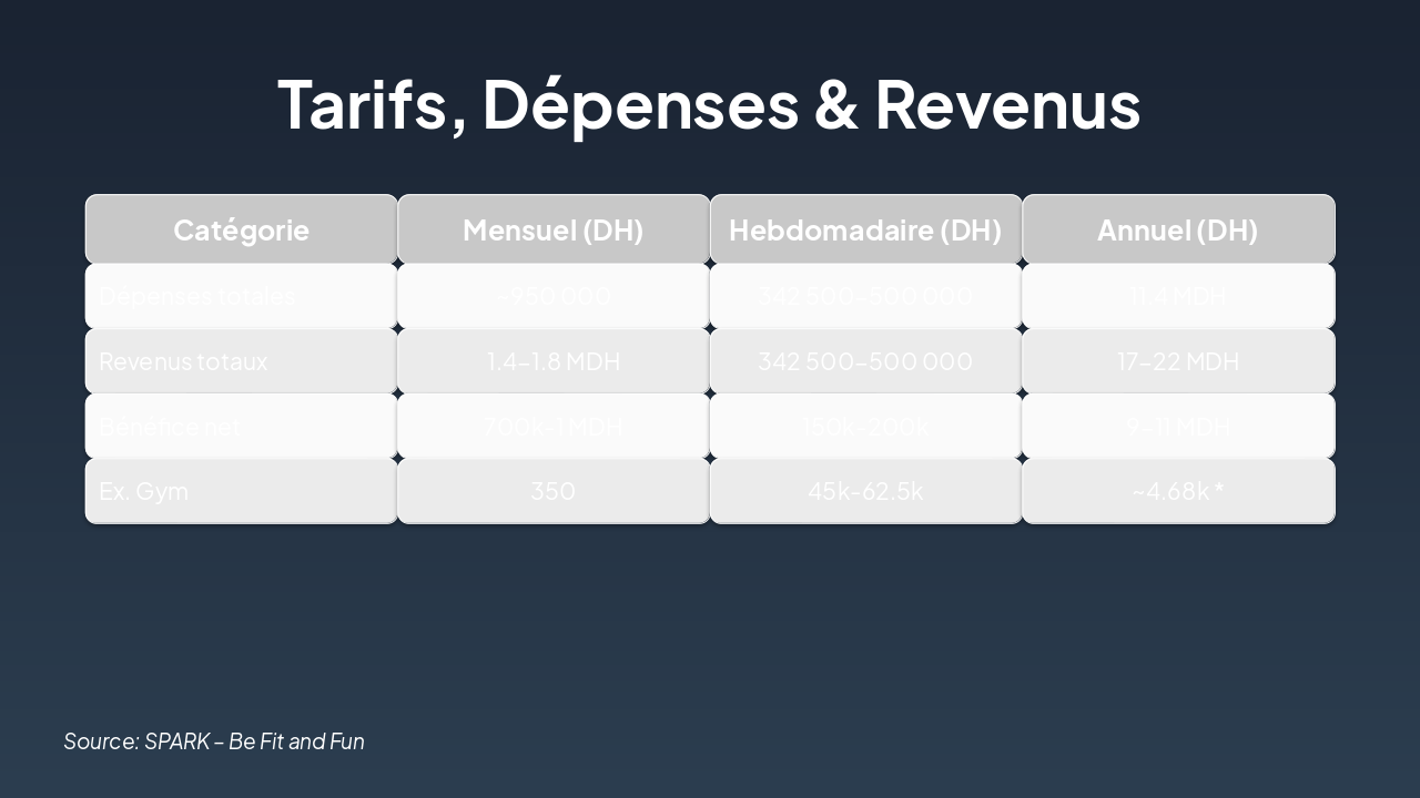 Le tableau présente les tarifs, dépenses et revenus mensuels, hebdomadaires et annuels en DH. Les dépenses totales s'élèvent à environ 950 000 DH/mois, les revenus à 1,4-1,8 MDH/mois, générant un bénéfice net de 700k-1 MDH/mois, avec un exemple pour une gym à 350 DH.