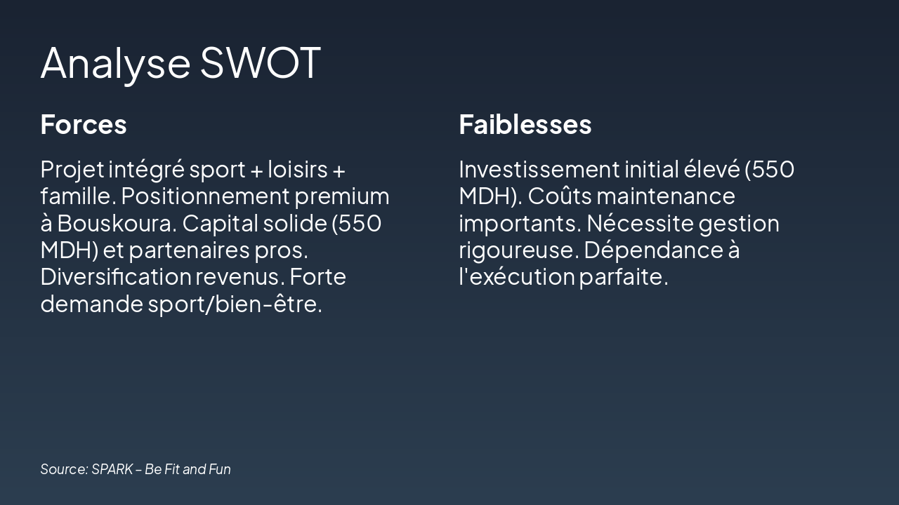 | Projet intégré sport + loisirs + famille. Positionnement premium à Bouskoura. Capital solide (550 MDH) et partenaires pros. Diversification revenus. Forte demande sport/bien-être. | Investissement initial élevé (550 MDH). Coûts maintenance importants. Nécessite gestion rigoureuse. Dépendance à l'exécution parfaite. |