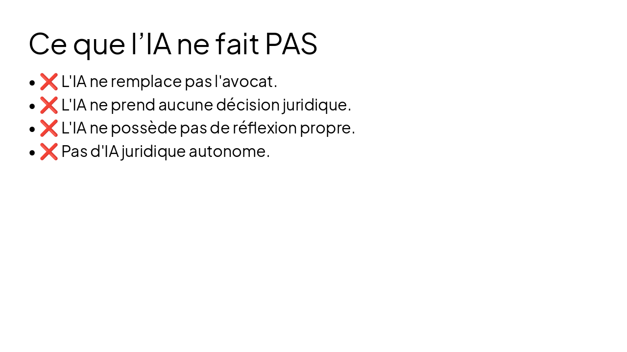 - ❌ L'IA ne remplace pas l'avocat.
