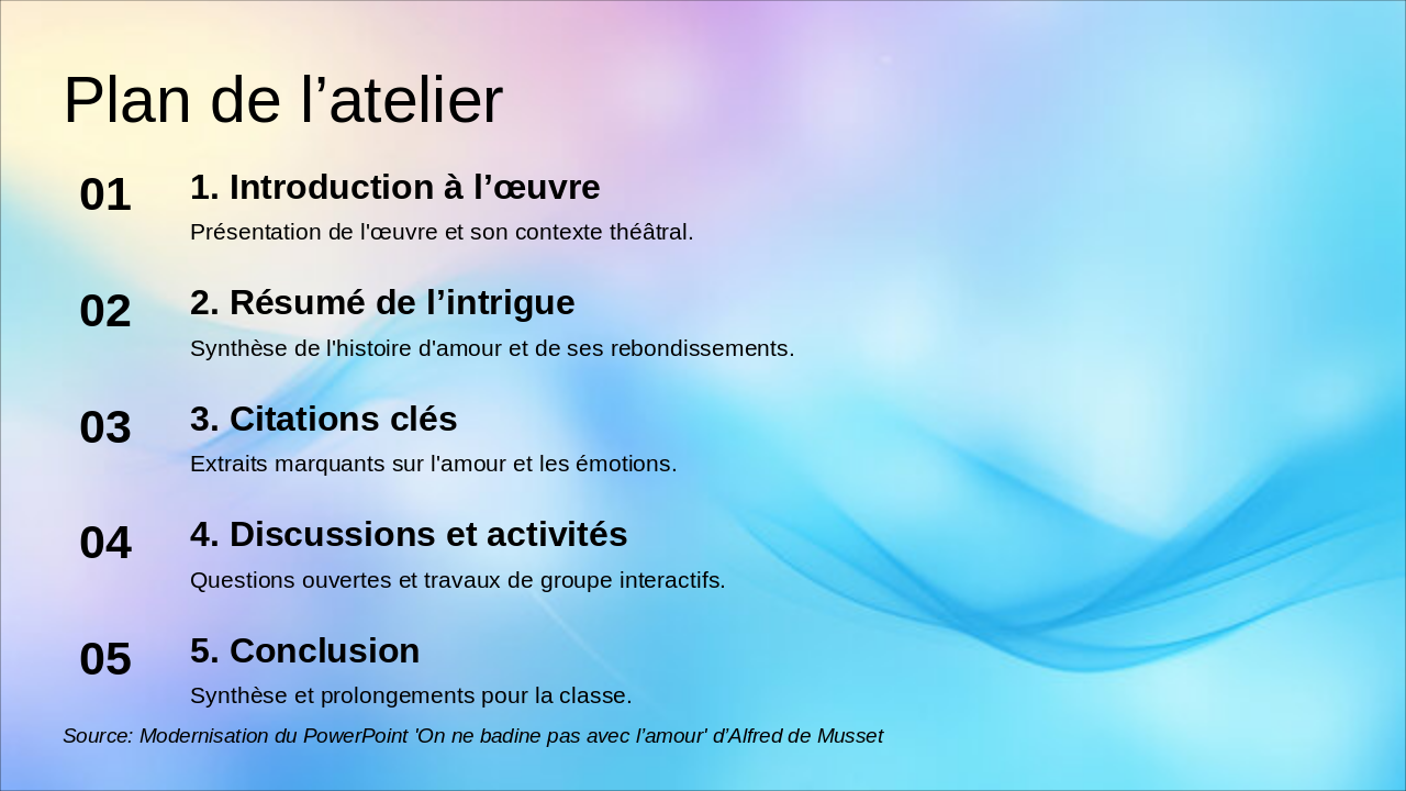 This title slide displays the French phrase "On ne badine pas avec l’amour" as its main text. The subtitle attributes it to Alfred de Musset and describes a "Modernisation dynamique pour l’atelier en classe."