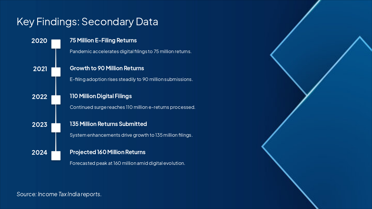 This timeline from secondary data tracks e-filing returns surging from 75 million in 2020 (pandemic-driven) to 90 million in 2021 and 110 million in 2022. Growth continued to 135 million in 2023, projecting 160 million in 2024 due to system enhancements and digital evolution.