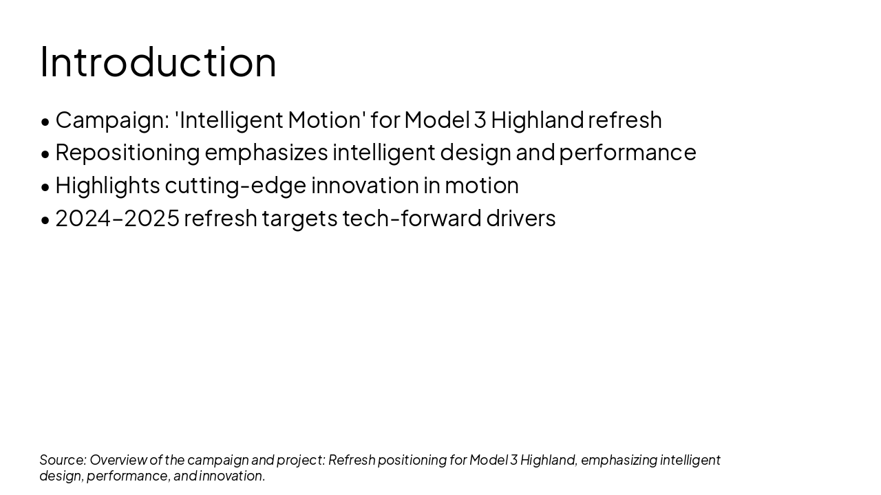This title slide is titled "Intelligent Motion" and features a subtitle highlighting the Tesla Model 3 Highland 2024–2025 Refresh. It serves as an introductory slide focused on advanced automotive technology and updates for the Tesla Model 3.