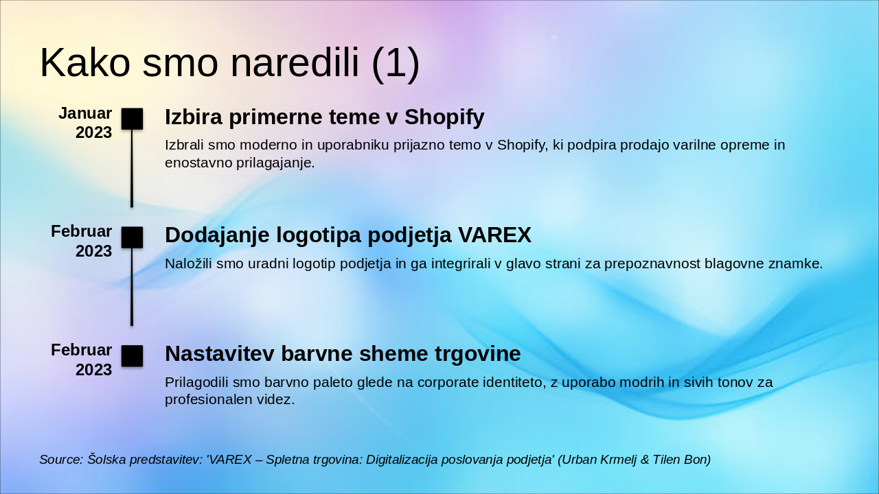 Januar 2023: Izbira primerne teme v Shopify Izbrali smo moderno in uporabniku prijazno temo v Shopify, ki podpira prodajo varilne opreme in enostavno prilagajanje. Februar 2023: Dodajanje logotipa podjetja VAREX Naložili smo uradni logotip podjetja in ga integrirali v glavo strani za prepoznavnost blagovne znamke. Februar 2023: Nastavitev barvne sheme trgovine Prilagodili smo barvno paleto glede na corporate identiteto, z uporabo modrih in sivih tonov za profesionalen videz.