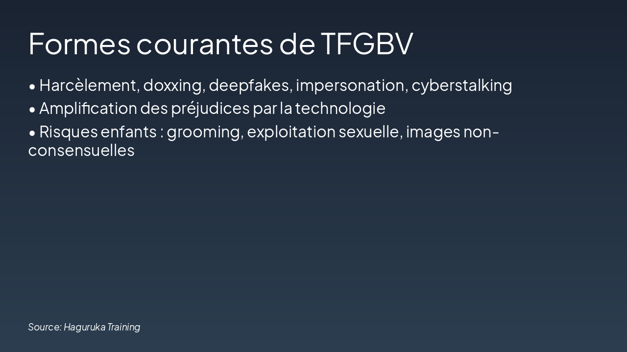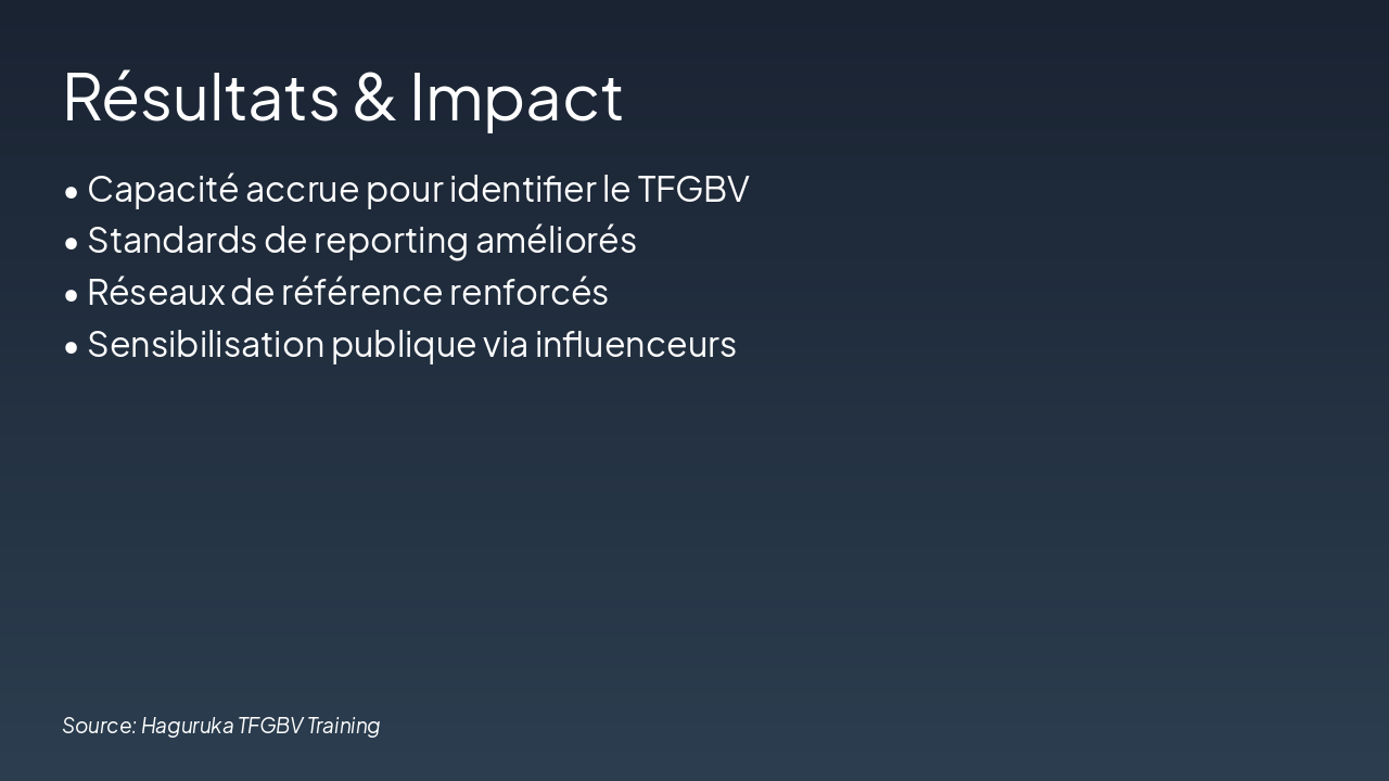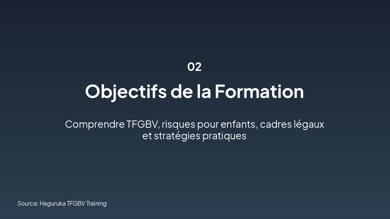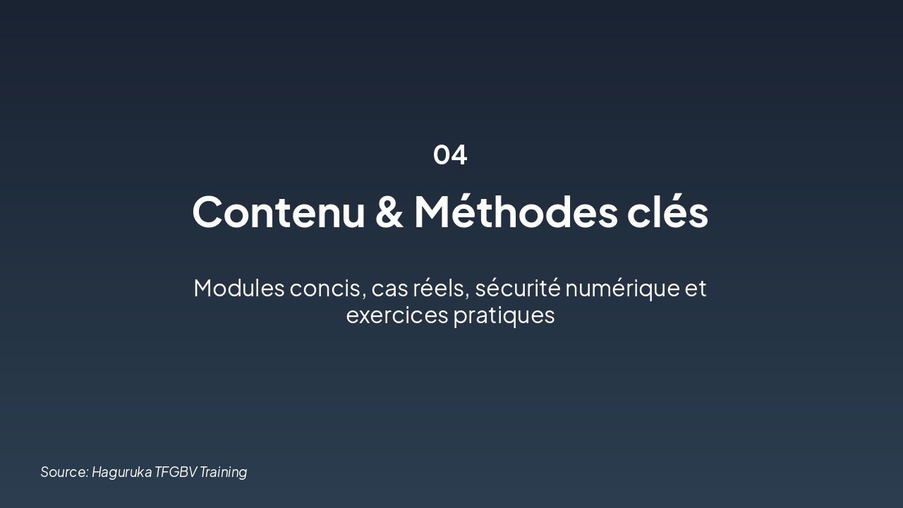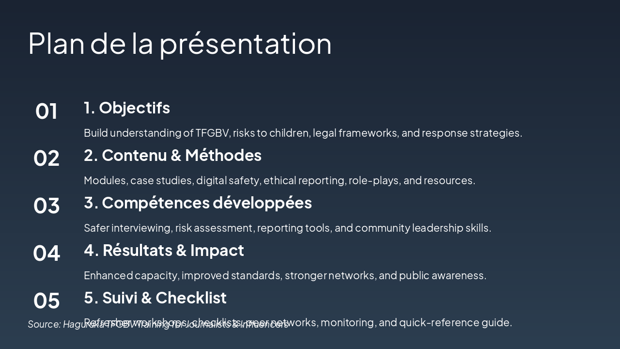 Ce plan de présentation couvre cinq points principaux : les objectifs (compréhension du TFGBV, risques pour les enfants, cadres légaux et stratégies de réponse), le contenu et les méthodes (modules, études de cas, sécurité numérique, etc.), les compétences développées (entretiens sécurisés, évaluation des risques, etc.), les résultats et impact (capacités renforcées, normes améliorées, etc.), ainsi que le suivi et la checklist (ateliers de rappel, réseaux pairs, etc.). Il s'agit d'un agenda structuré pour une formation complète sur la lutte contre le TFGBV.