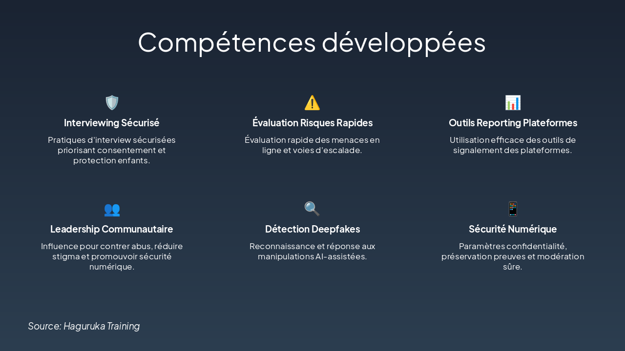 Safer interviewing, risk assessment, reporting tools, and community leadership skills.