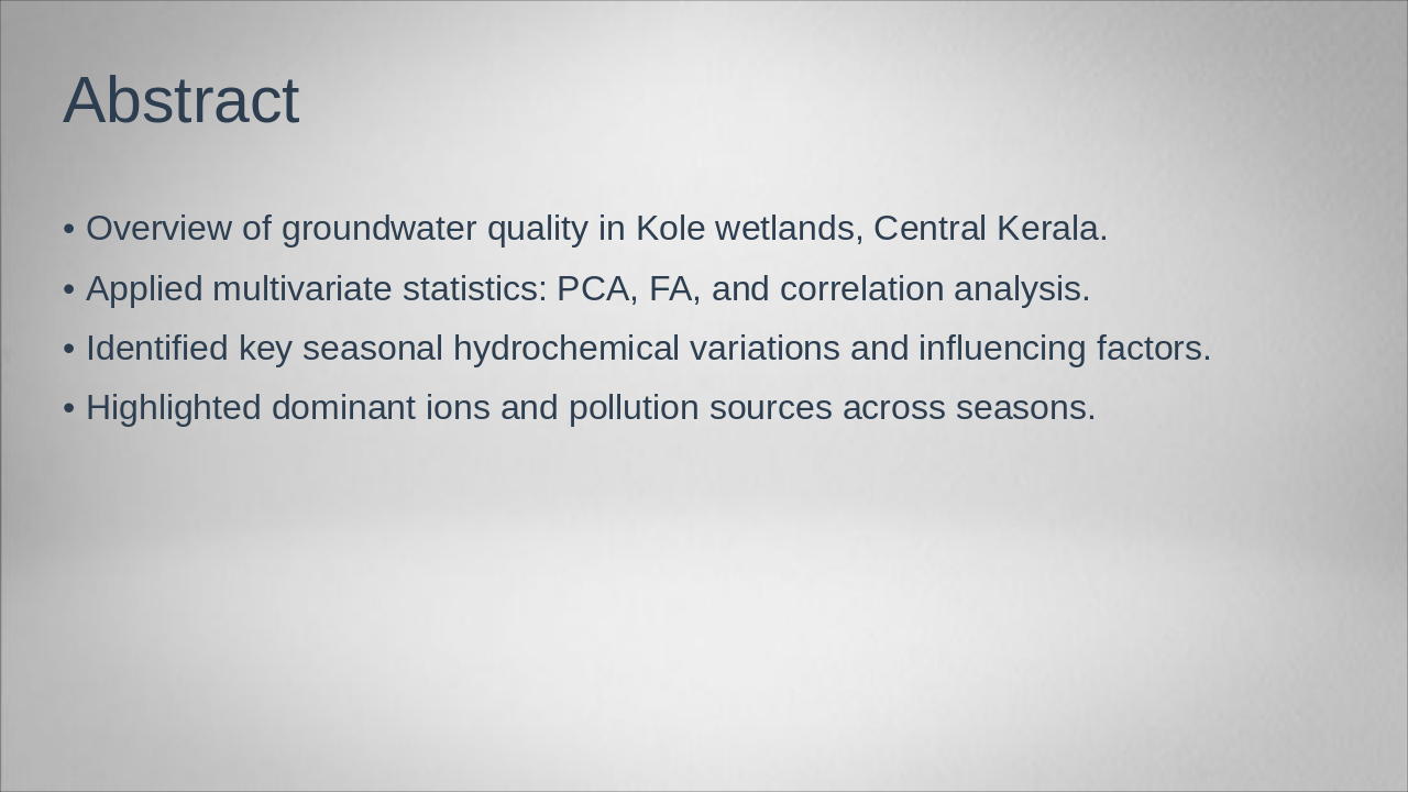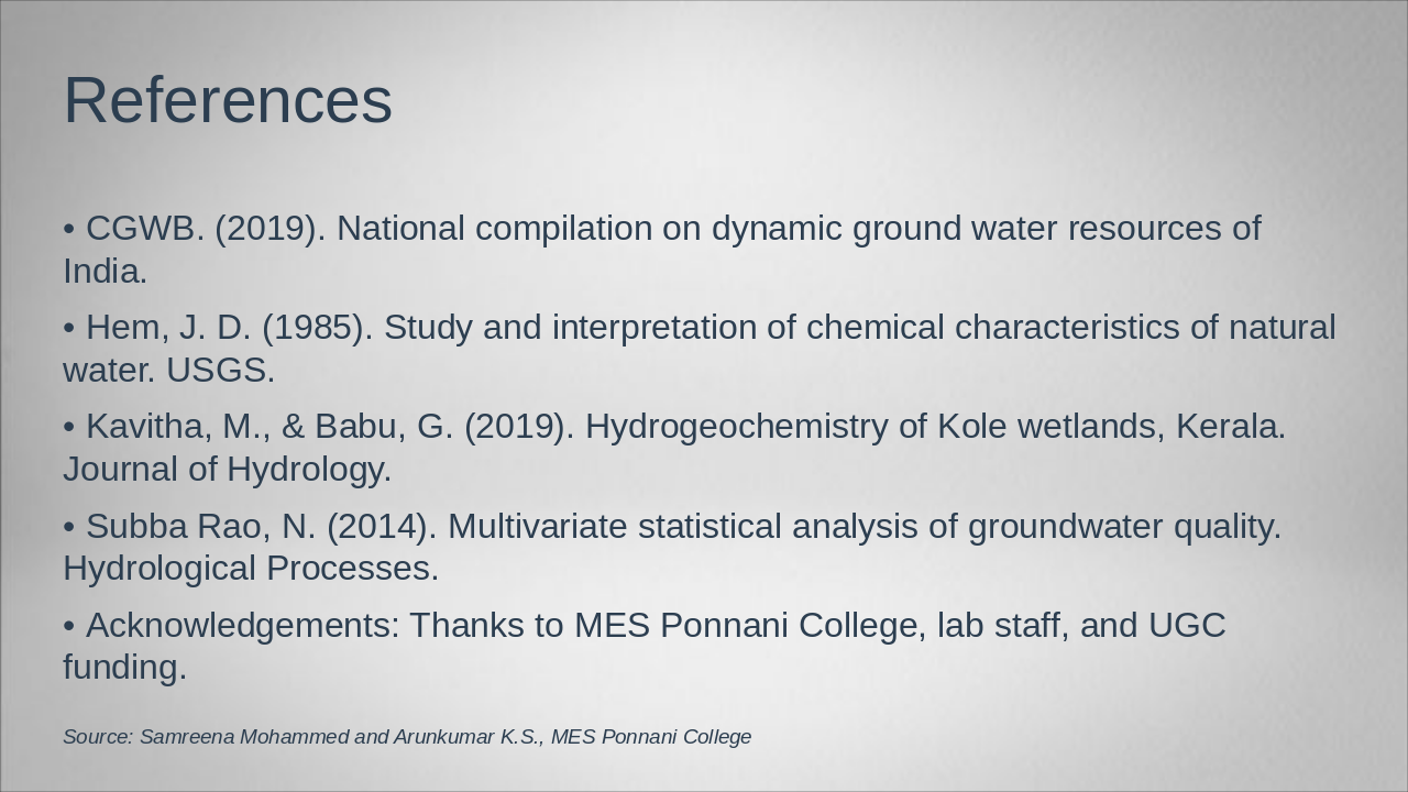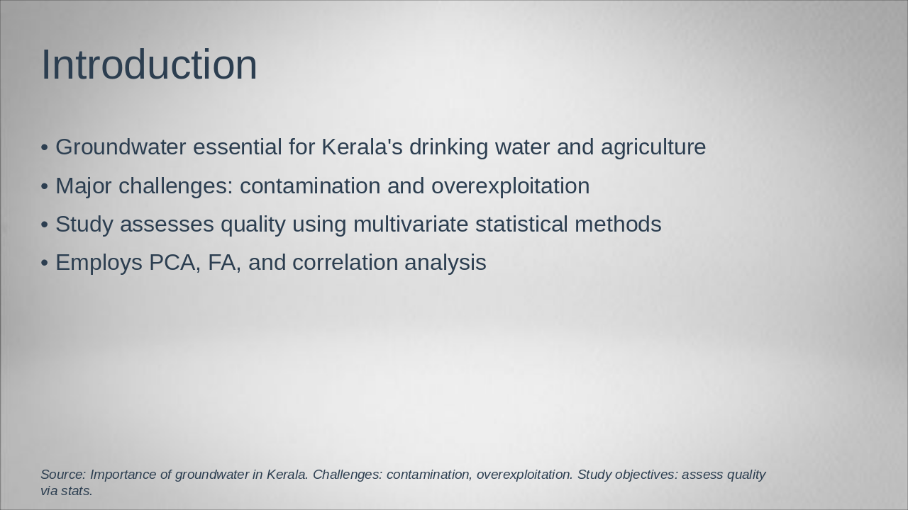 Source: Assessing Groundwater Resources in Central Kerala, India: A Multivariate Statistical Approach Samreena Mohammed & Arunkumar K.S. MES Ponnani College