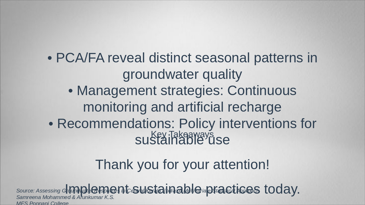 PCA/FA analysis reveals distinct seasonal patterns in groundwater quality, with recommended management strategies including continuous monitoring and artificial recharge. The slide urges policy interventions for sustainable use and calls to implement sustainable practices today.
