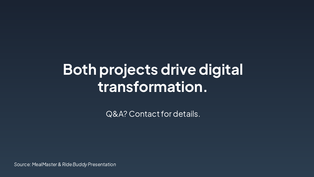 The "Comparison Summary" table compares MealMaster and Ride Buddy on Automation, User Convenience, and Digital Transformation. Both platforms provide enabling features (e.g., online orders/bookings, browsing/searching, unified/paperless systems), sharing a common goal of efficiency boosts.