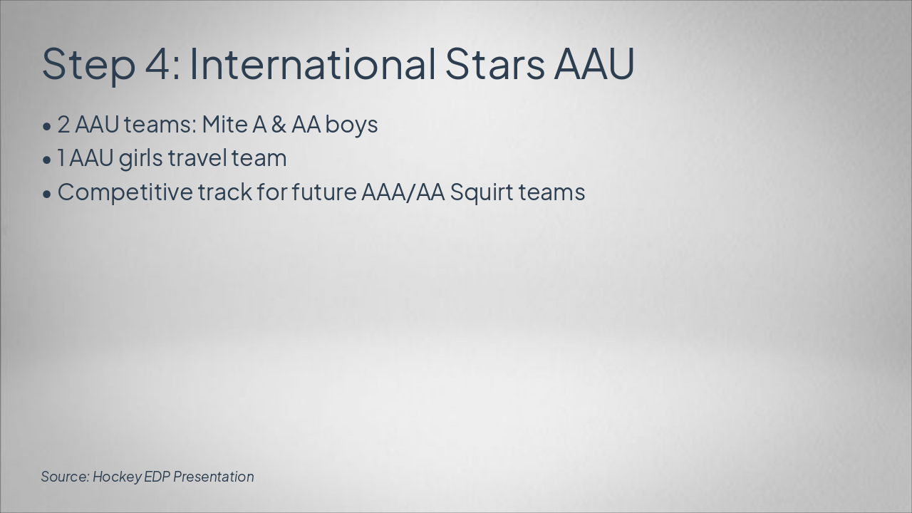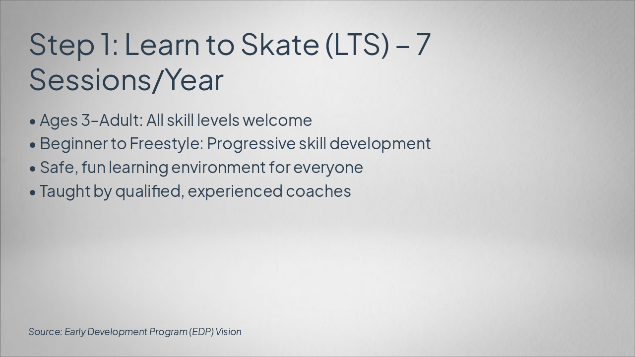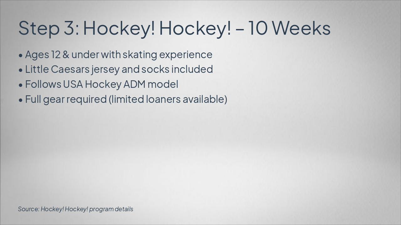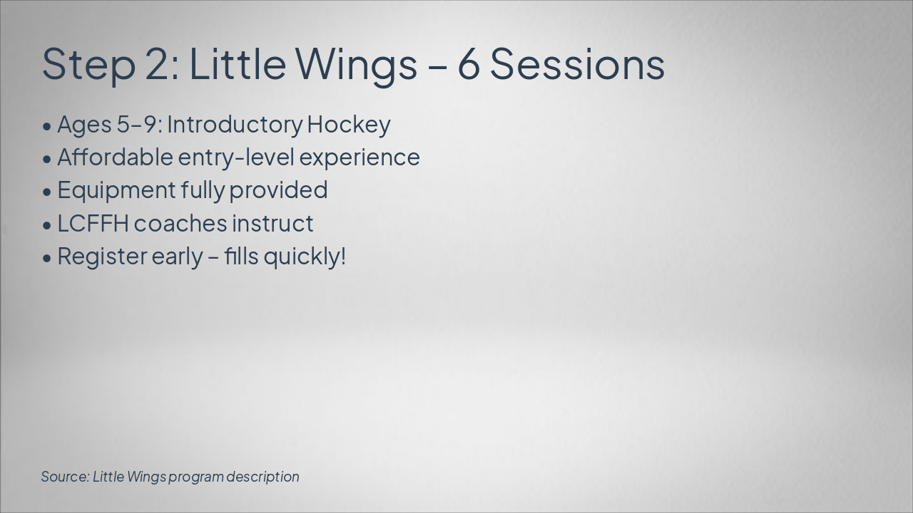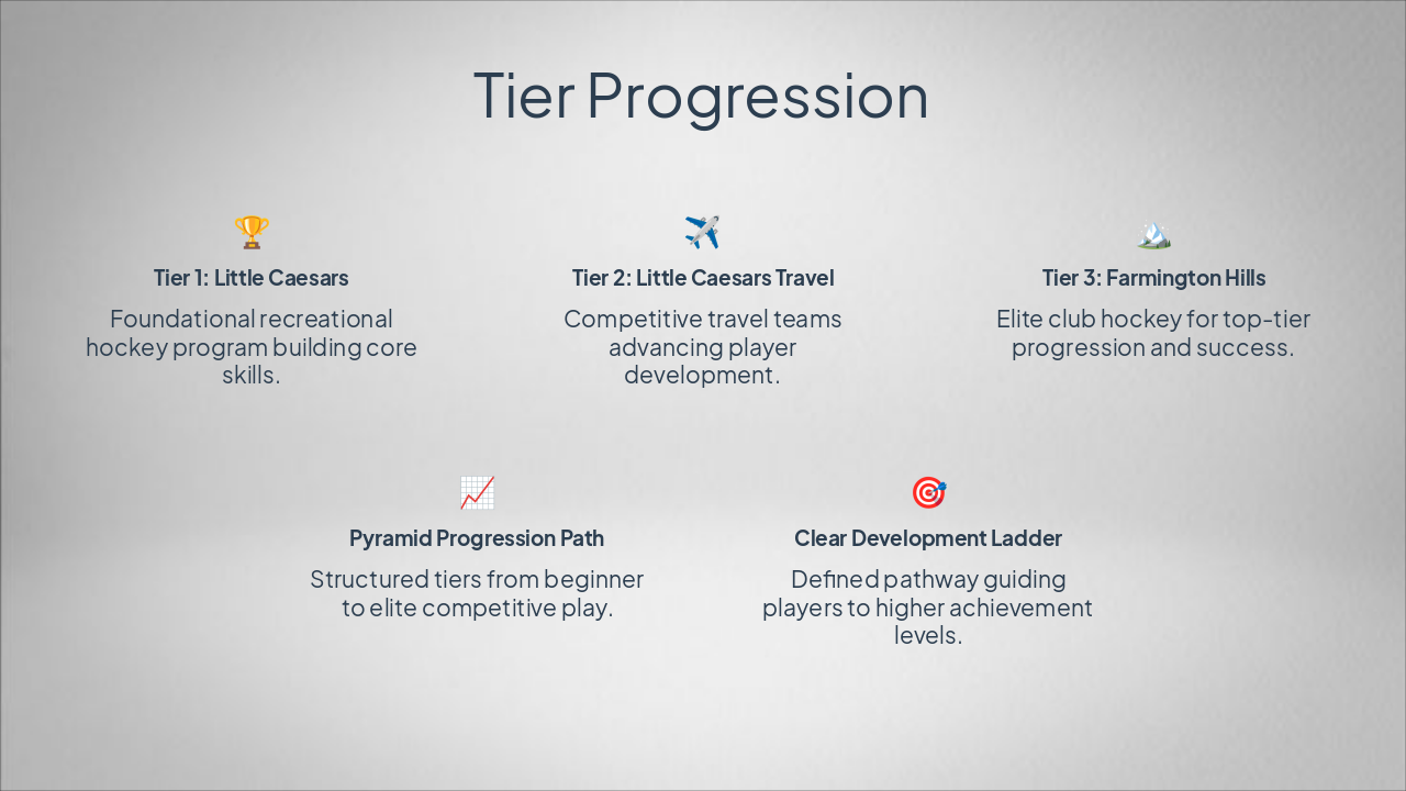 Step 1: Learn to Skate (LTS) Ages 3–Adult. Beginner to Freestyle. Safe, fun environment with qualified coaches. Step 2: Little Wings Intro Ages 5–9. Affordable hockey intro with provided equipment and LCFFH coaches. Step 3: Hockey! Hockey! Program Ages 12 & under. 10-week USA Hockey ADM model with jersey included. Step 4: International Stars AAU Competitive AAU teams (Mite A/AA boys, girls travel) leading to AAA/AA. Future: Tier Progression Path Advance to Tier 1 Little Caesars, Tier 2 Travel, Tier 3 Farmington Hills.