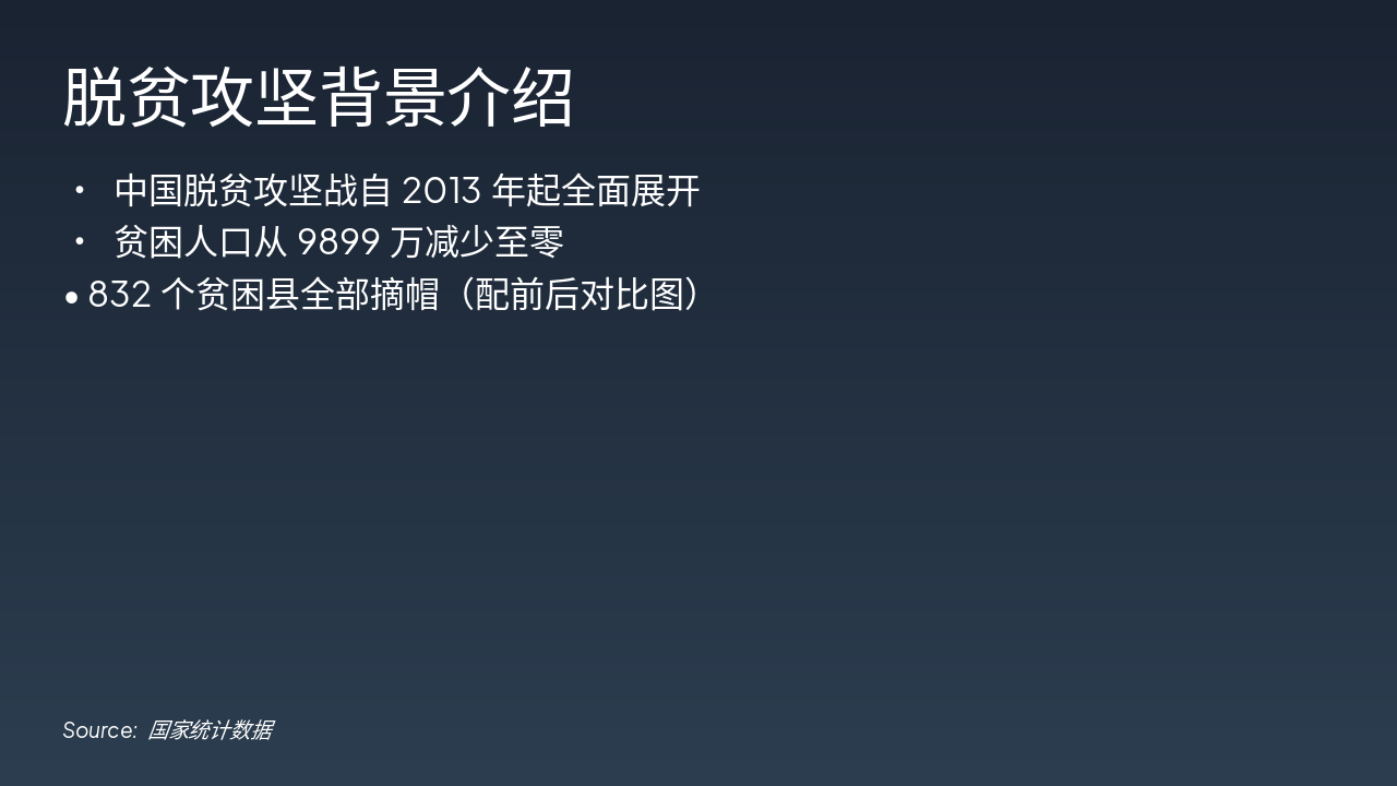 展示中国脱贫攻坚战从2013年起减贫9899万至零的辉煌历程,涵盖背景、精准战略、区域案例、教育医疗产业成效及乡村振兴衔接,致敬扶贫英雄。(98字)