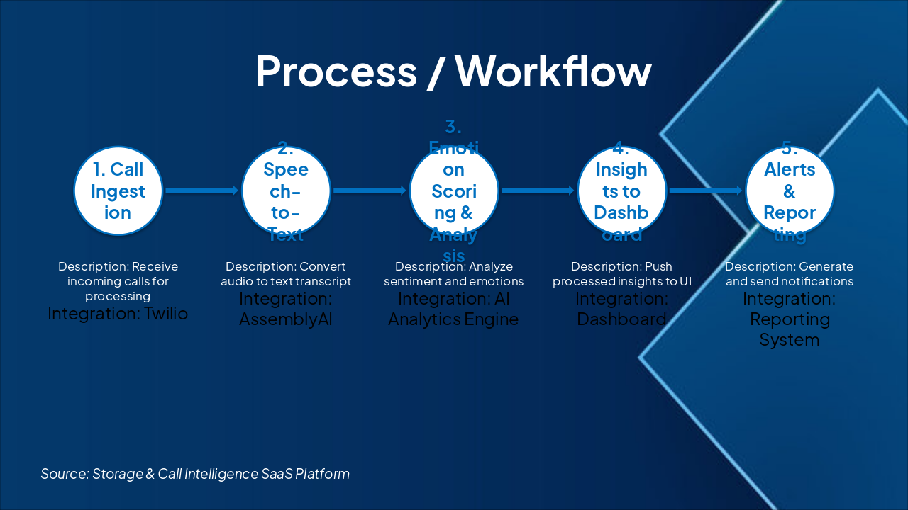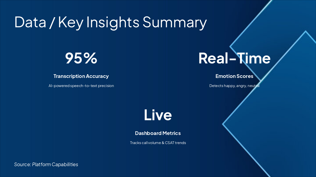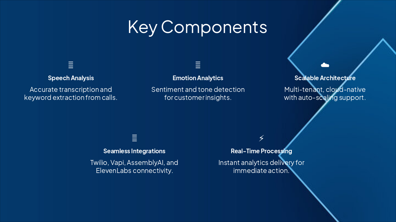 { "features": [ { "icon": "🎤", "heading": "Speech Analysis", "description": "Accurate transcription and keyword extraction from calls." }, { "icon": "😌", "heading": "Emotion Analytics", "description": "Sentiment and tone detection for customer insights." }, { "icon": "☁️", "heading": "Scalable Architecture", "description": "Multi-tenant, cloud-native with auto-scaling support." }, { "icon": "🔗", "heading": "Seamless Integrations", "description": "Twilio, Vapi, AssemblyAI, and ElevenLabs connectivity." }, { "icon": "⚡", "heading": "Real-Time Processing", "description": "Instant analytics delivery for immediate action." } ] }