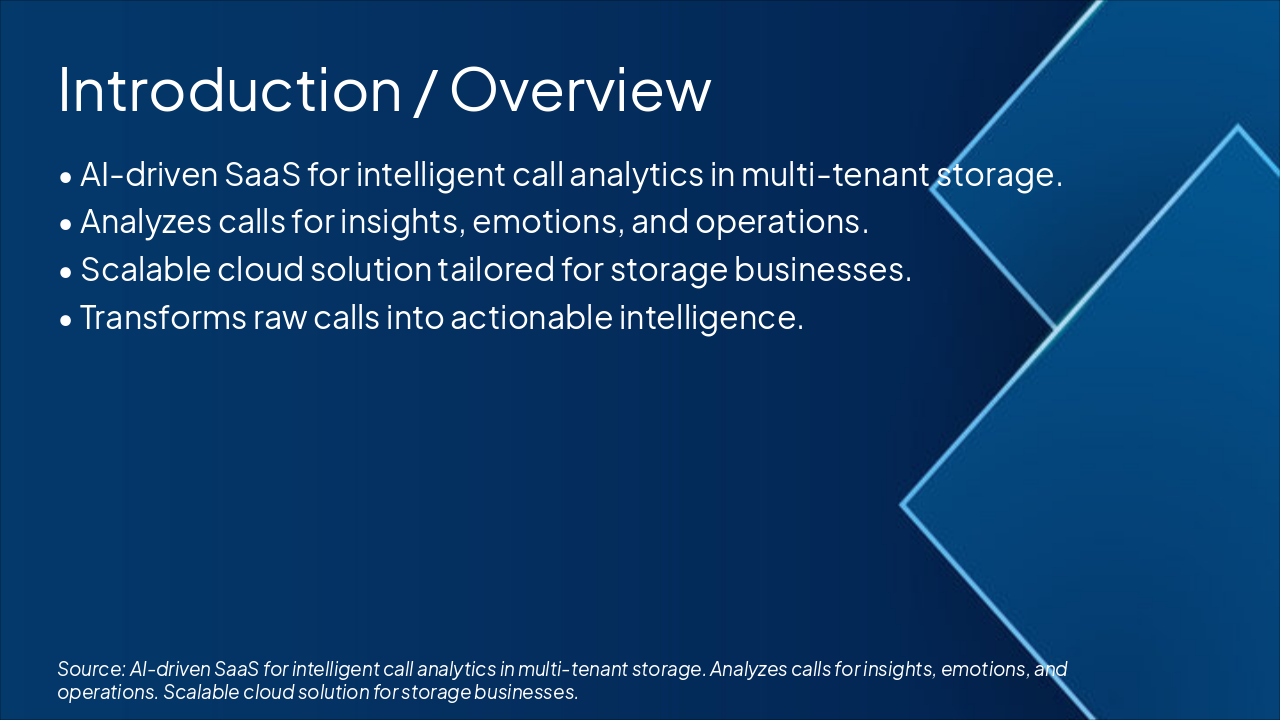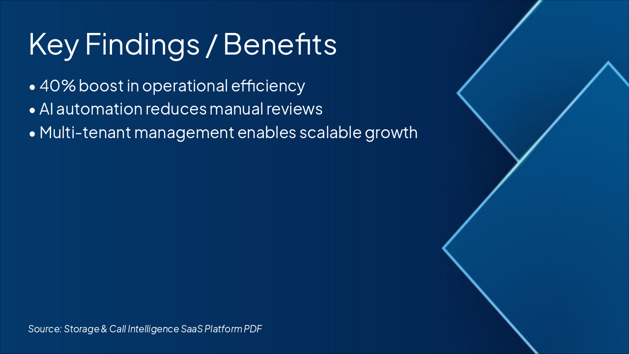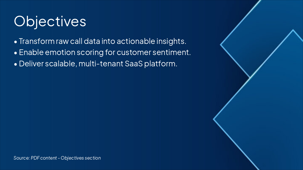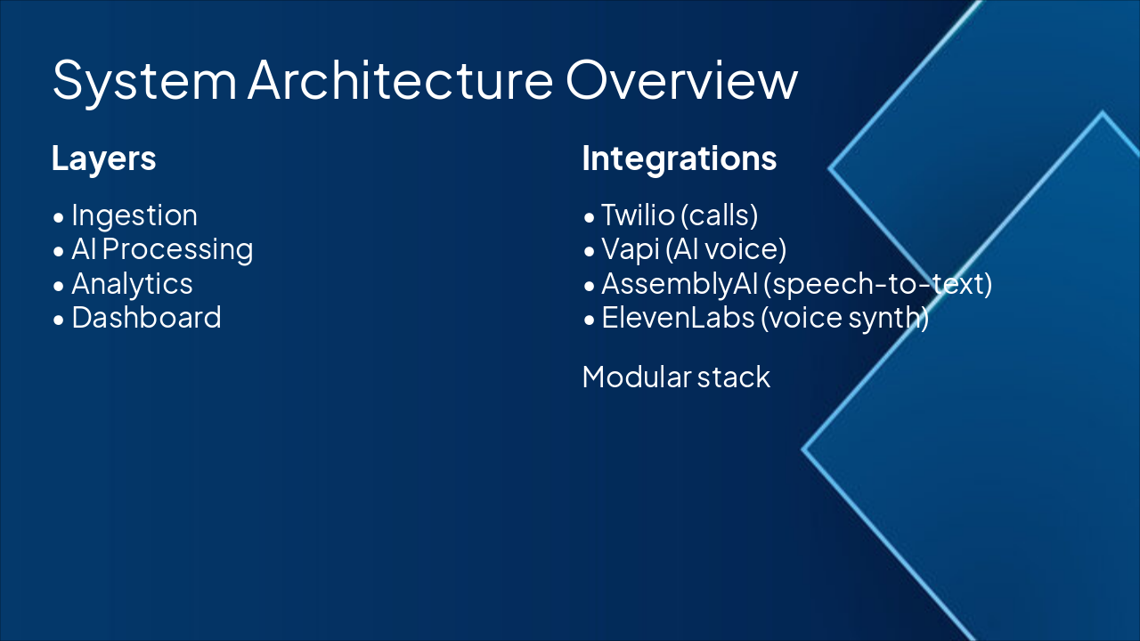 { "features": [ { "icon": "🎤", "heading": "Speech Analysis", "description": "Accurate transcription and keyword extraction from calls." }, { "icon": "😌", "heading": "Emotion Analytics", "description": "Sentiment and tone detection for customer insights." }, { "icon": "☁️", "heading": "Scalable Architecture", "description": "Multi-tenant, cloud-native with auto-scaling support." }, { "icon": "🔗", "heading": "Seamless Integrations", "description": "Twilio, Vapi, AssemblyAI, and ElevenLabs connectivity." }, { "icon": "⚡", "heading": "Real-Time Processing", "description": "Instant analytics delivery for immediate action." } ] }
