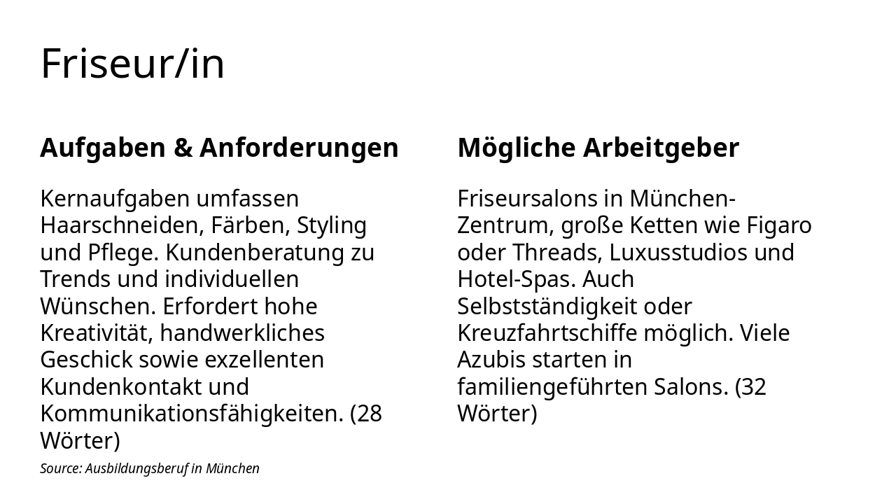 | Kernaufgaben umfassen Haarschneiden, Färben, Styling und Pflege. Kundenberatung zu Trends und individuellen Wünschen. Erfordert hohe Kreativität, handwerkliches Geschick sowie exzellenten Kundenkontakt und Kommunikationsfähigkeiten. (28 Wörter) | Friseursalons in München-Zentrum, große Ketten wie Figaro oder Threads, Luxusstudios und Hotel-Spas. Auch Selbstständigkeit oder Kreuzfahrtschiffe möglich. Viele Azubis starten in familiengeführten Salons. (32 Wörter) |