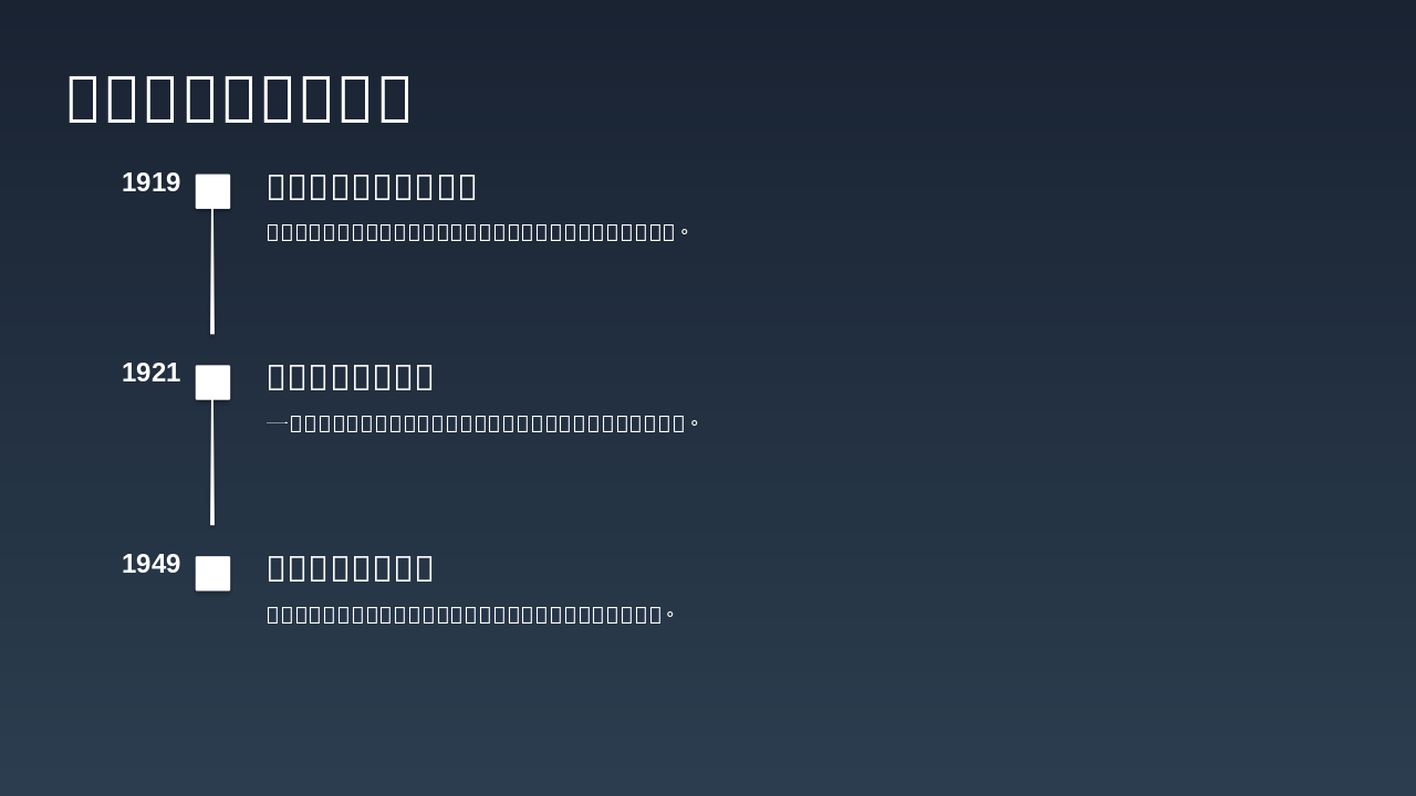 1919: 五四运动点燃爱国火炬 青年学生发起反帝反封建运动,唤醒民族觉醒,注入爱国主义精神。 1921: 建党青年奠基革命 一批先进青年创立中国共产党,领导人民走向新民主主义革命道路。 1949: 先辈榜样激励后人 革命先辈以青春奉献铸就新中国,激励新时代青年担当复兴大任。