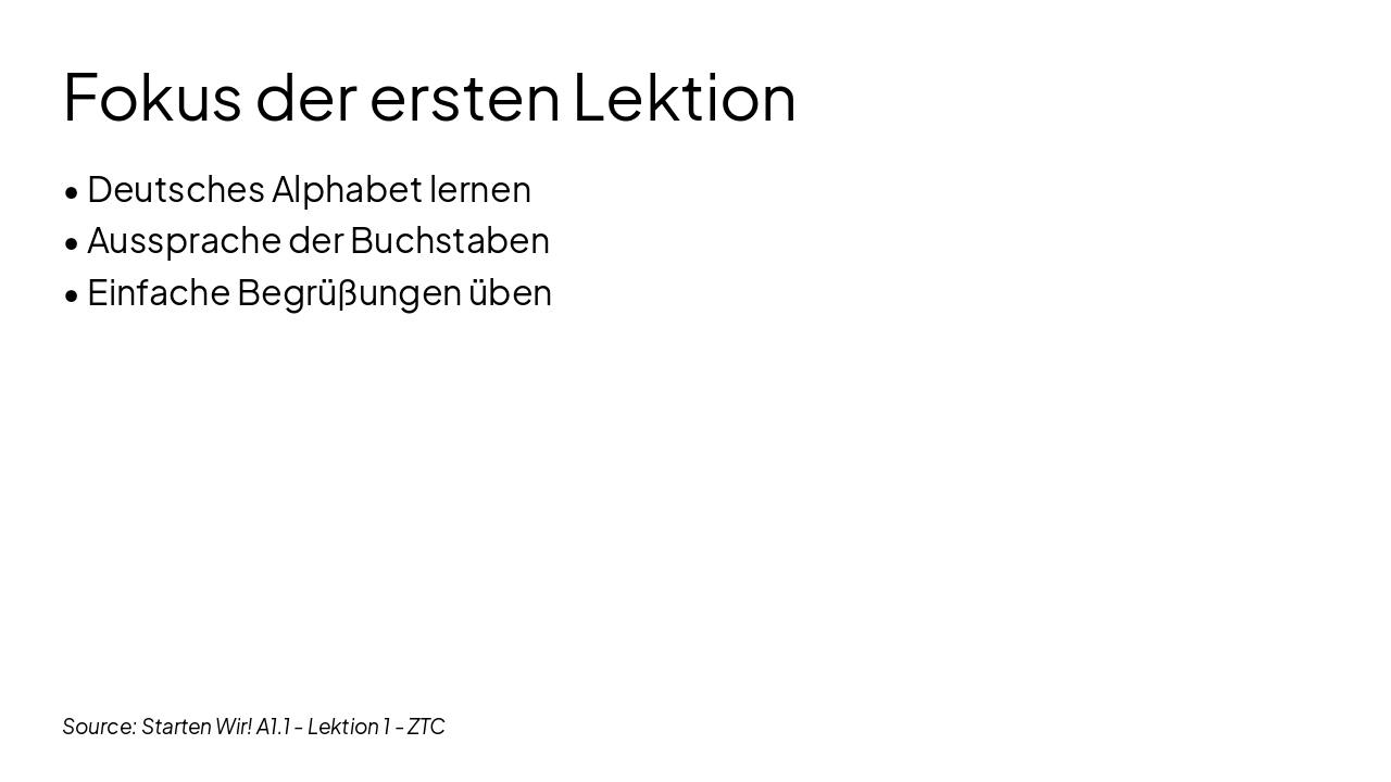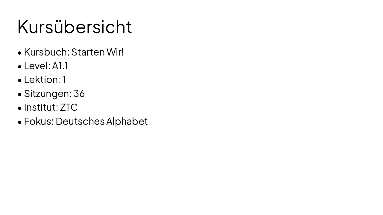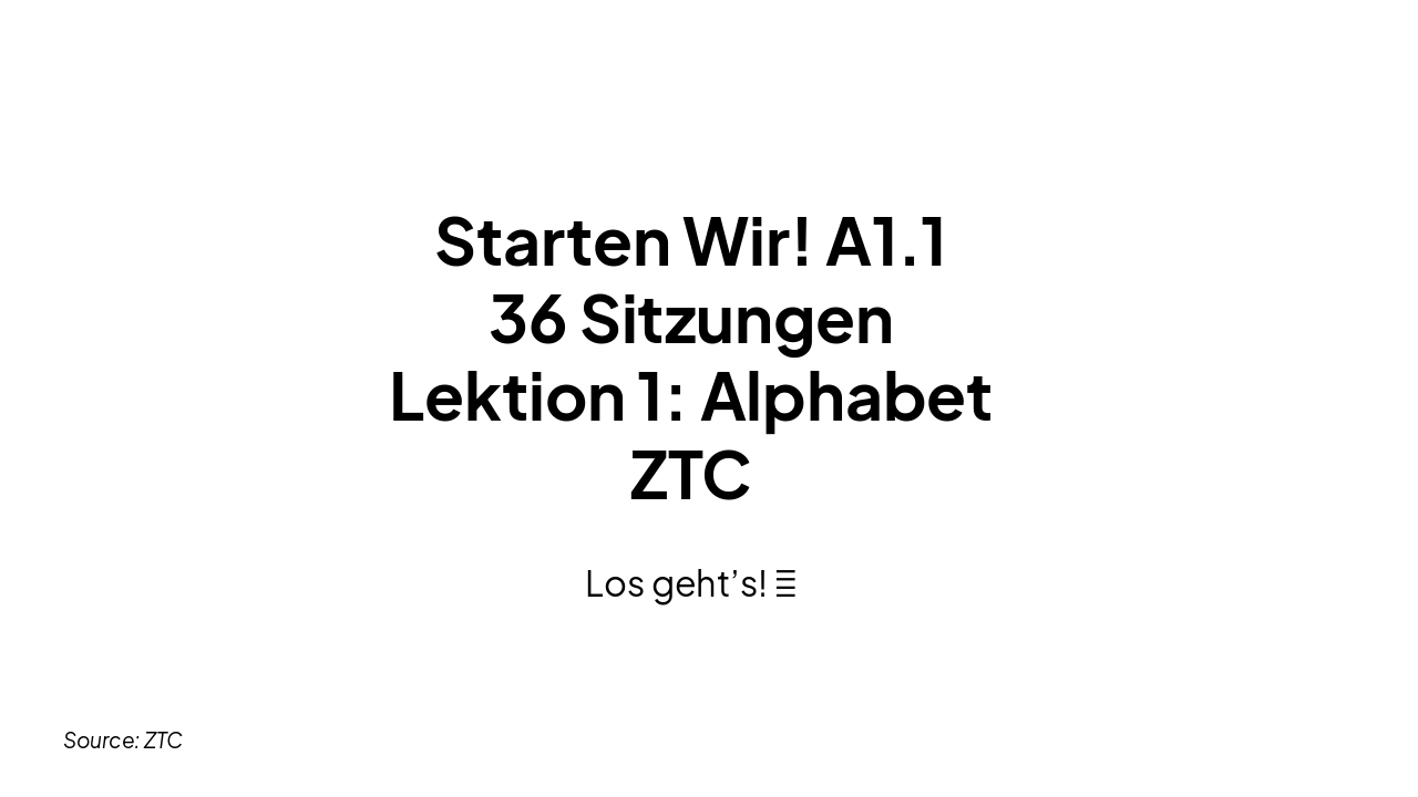 This title slide announces "Starten Wir! Level A1.1 Lektion 1," marking the beginning of Lesson 1 in beginner German. The subtitle notes it's part of a 36-session German course.