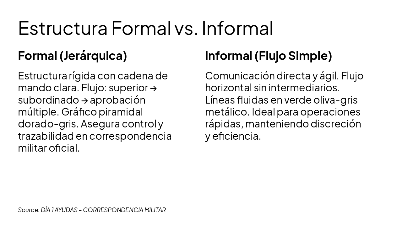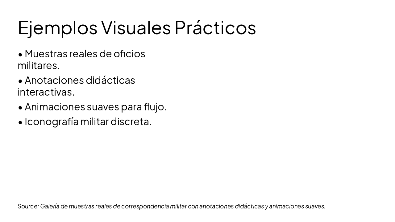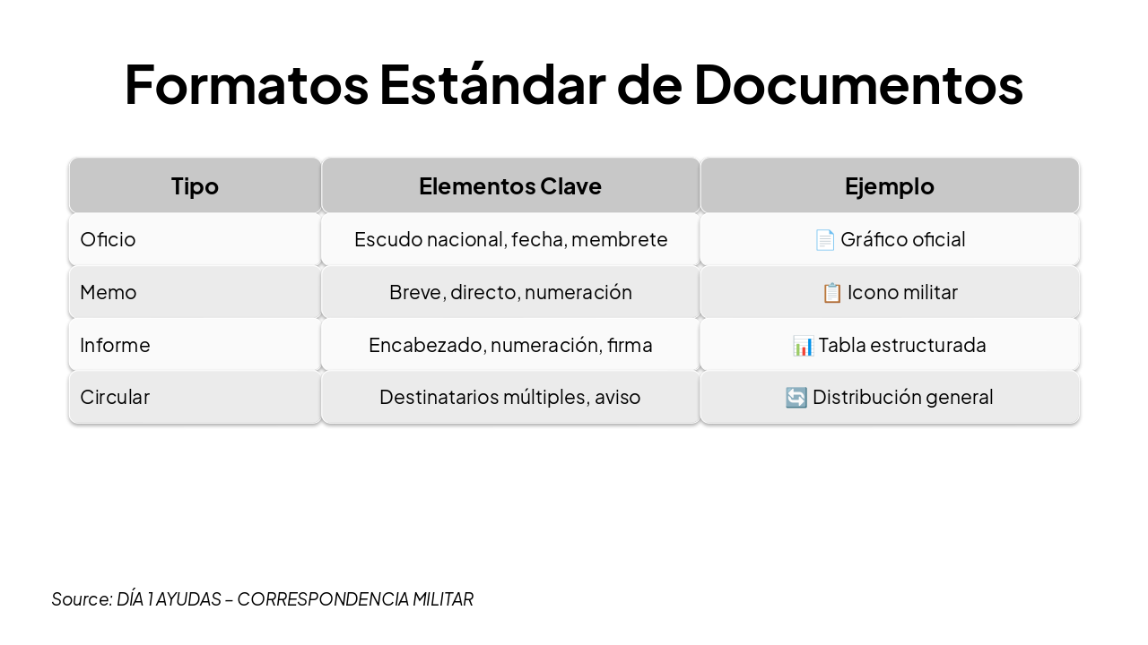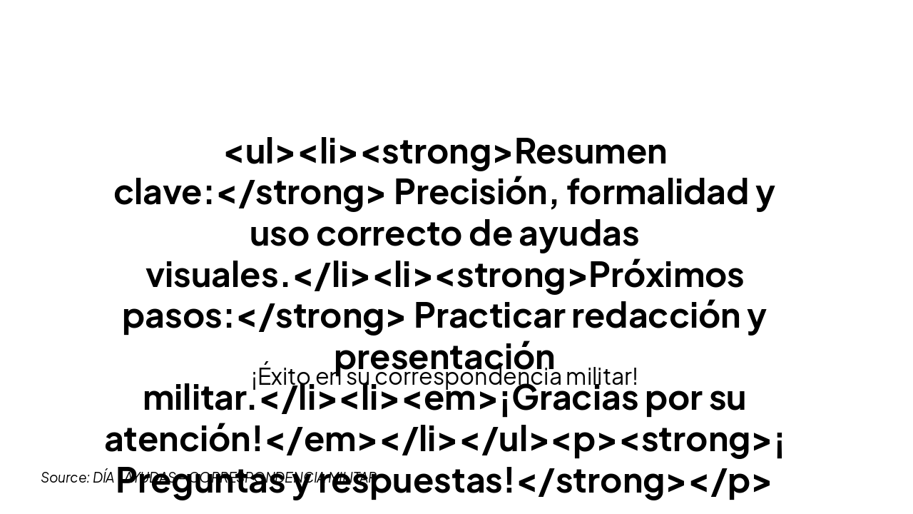 <ul><li><strong>Resumen clave:</strong> Precisión, formalidad y uso correcto de ayudas visuales.</li><li><strong>Próximos pasos:</strong> Practicar redacción y presentación militar.</li><li><em>¡Gracias por su atención!</em></li></ul><p><strong>¡Preguntas y respuestas!</strong></p>