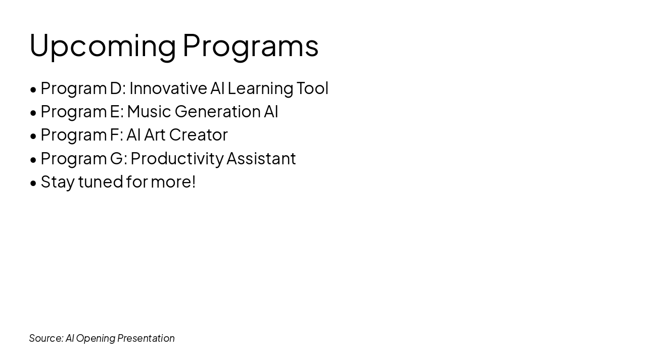 This title slide, titled "AI Opening Presentation," introduces the topic with a subtitle "Discover Open AI Programs & What's Coming Soon." It serves as the opening for a presentation exploring available Open AI programs and upcoming developments.