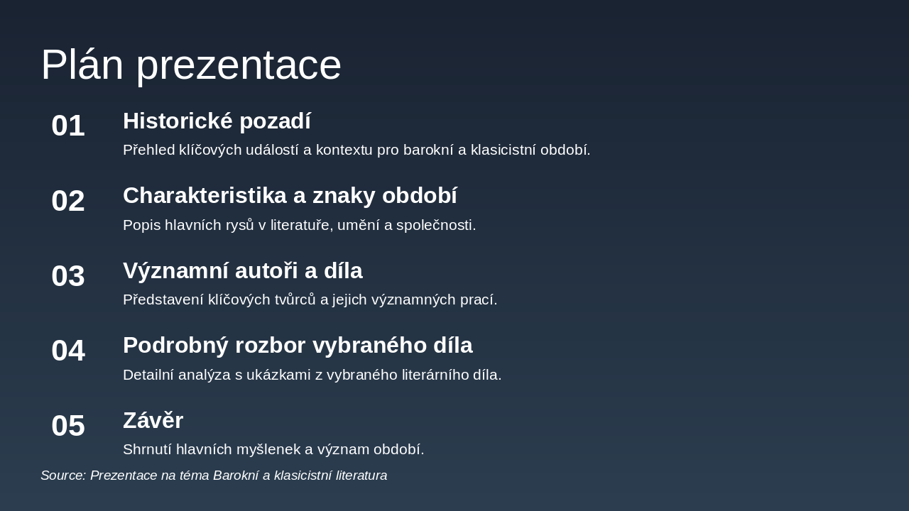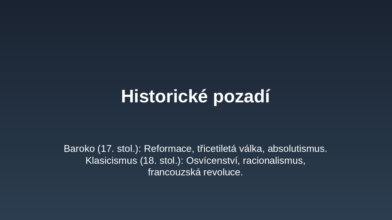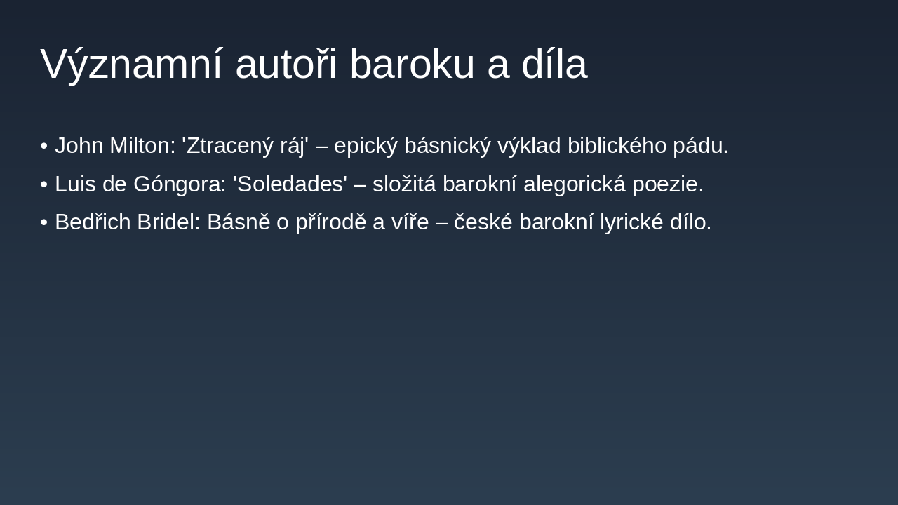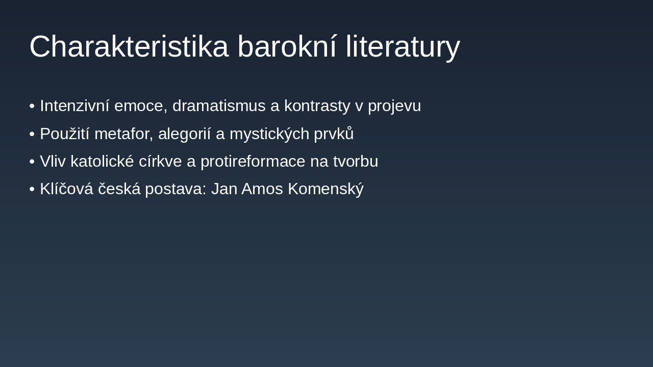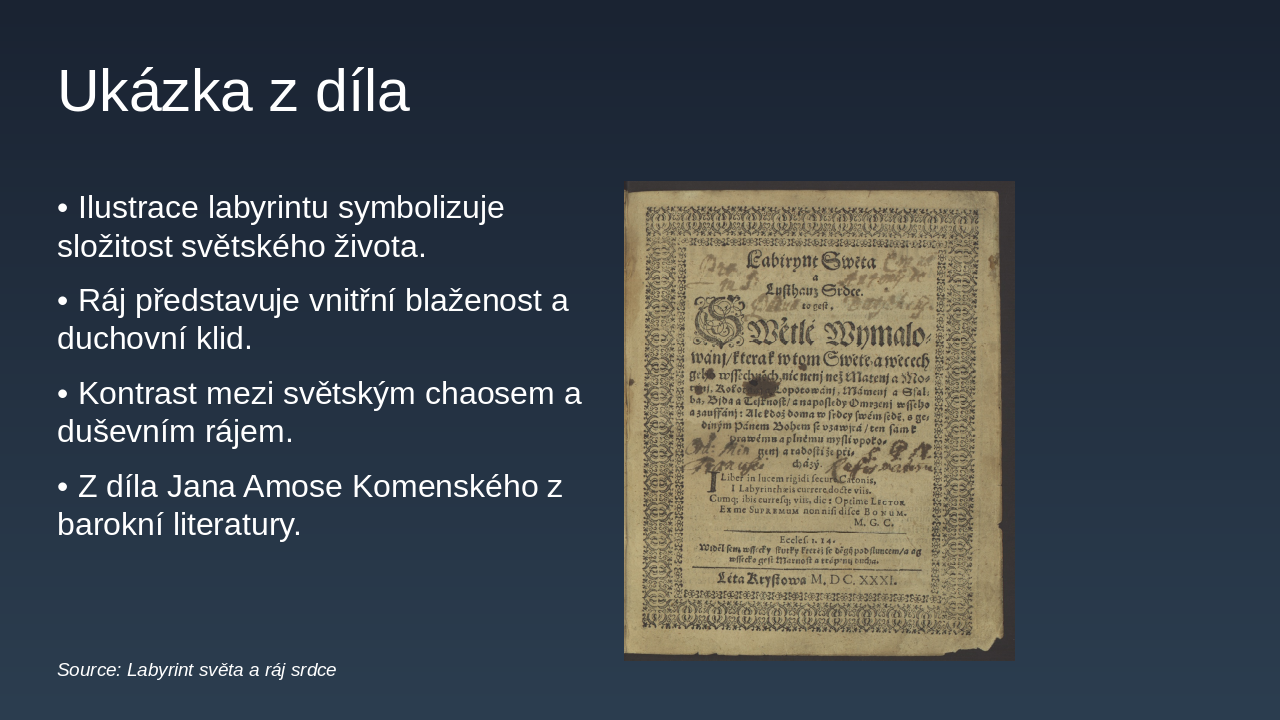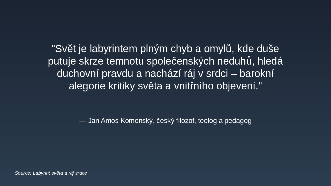 The slide features a quote from Jan Amos Komenský's work Labyrint světa a ráj srdce, portraying the world as a labyrinth filled with errors and societal ills, where the soul navigates darkness to seek spiritual truth. It ultimately discovers paradise within the heart, serving as a Baroque allegory of worldly critique and inner revelation.