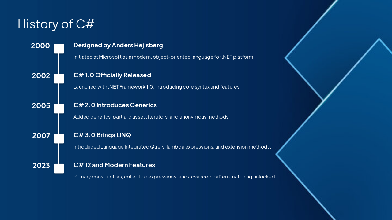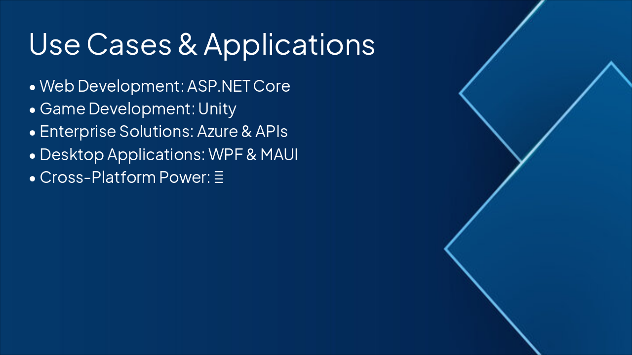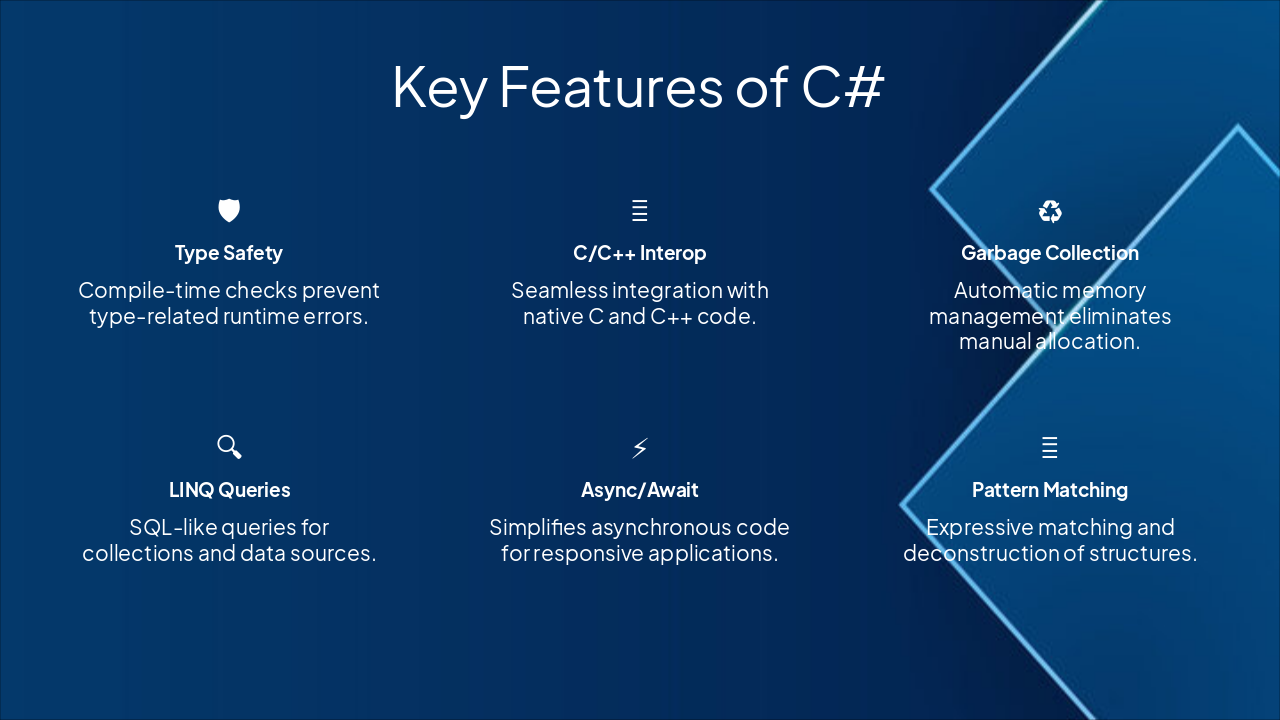 { "features": [ { "icon": "🛡️", "heading": "Type Safety", "description": "Compile-time checks prevent type-related runtime errors." }, { "icon": "🔗", "heading": "C/C++ Interop", "description": "Seamless integration with native C and C++ code." }, { "icon": "♻️", "heading": "Garbage Collection", "description": "Automatic memory management eliminates manual allocation." }, { "icon": "🔍", "heading": "LINQ Queries", "description": "SQL-like queries for collections and data sources." }, { "icon": "⚡", "heading": "Async/Await", "description": "Simplifies asynchronous code for responsive applications." }, { "icon": "🎯", "heading": "Pattern Matching", "description": "Expressive matching and deconstruction of structures." } ] }