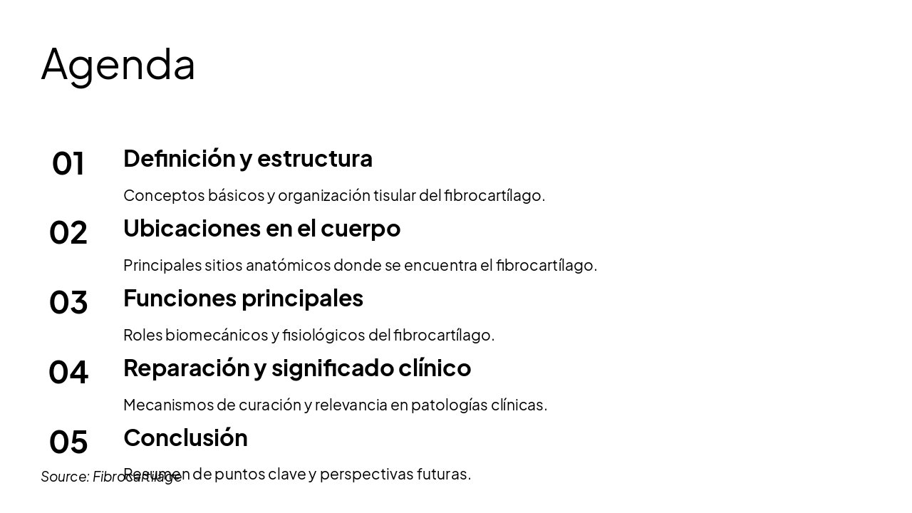 La agenda presenta los temas clave sobre el fibrocartílago: definición y estructura, ubicaciones en el cuerpo, funciones principales, reparación y significado clínico. Concluye con un resumen de puntos clave y perspectivas futuras.