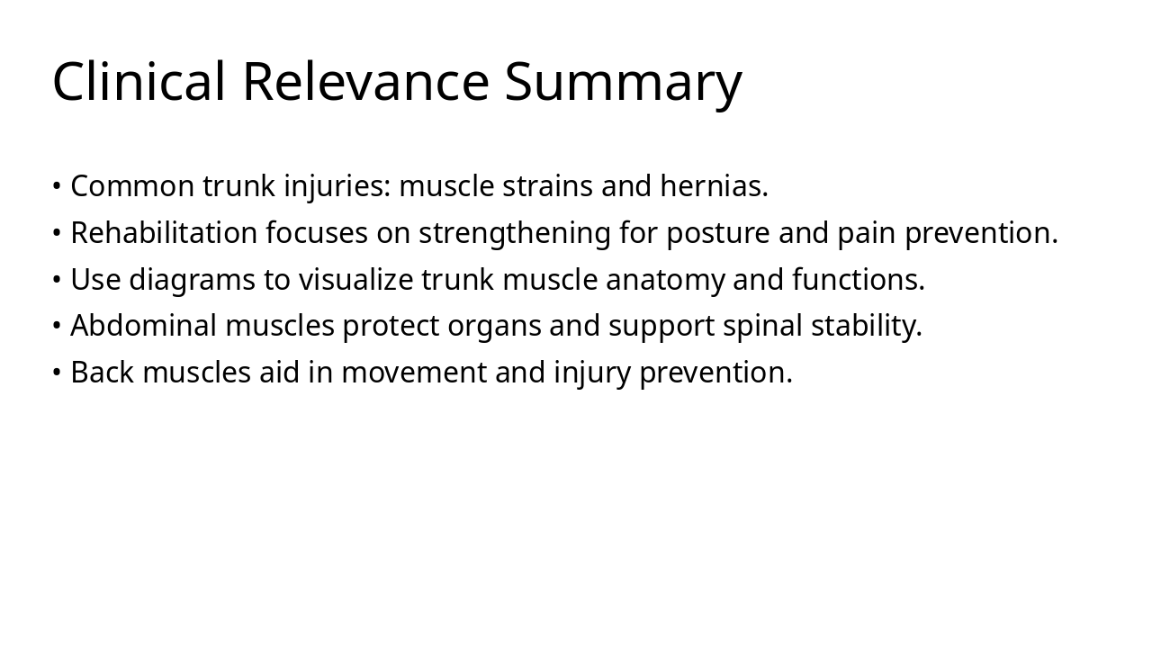 Injuries, applications, and summary of trunk anatomy insights. Source: A detailed presentation on the anatomy of the trunk muscles.