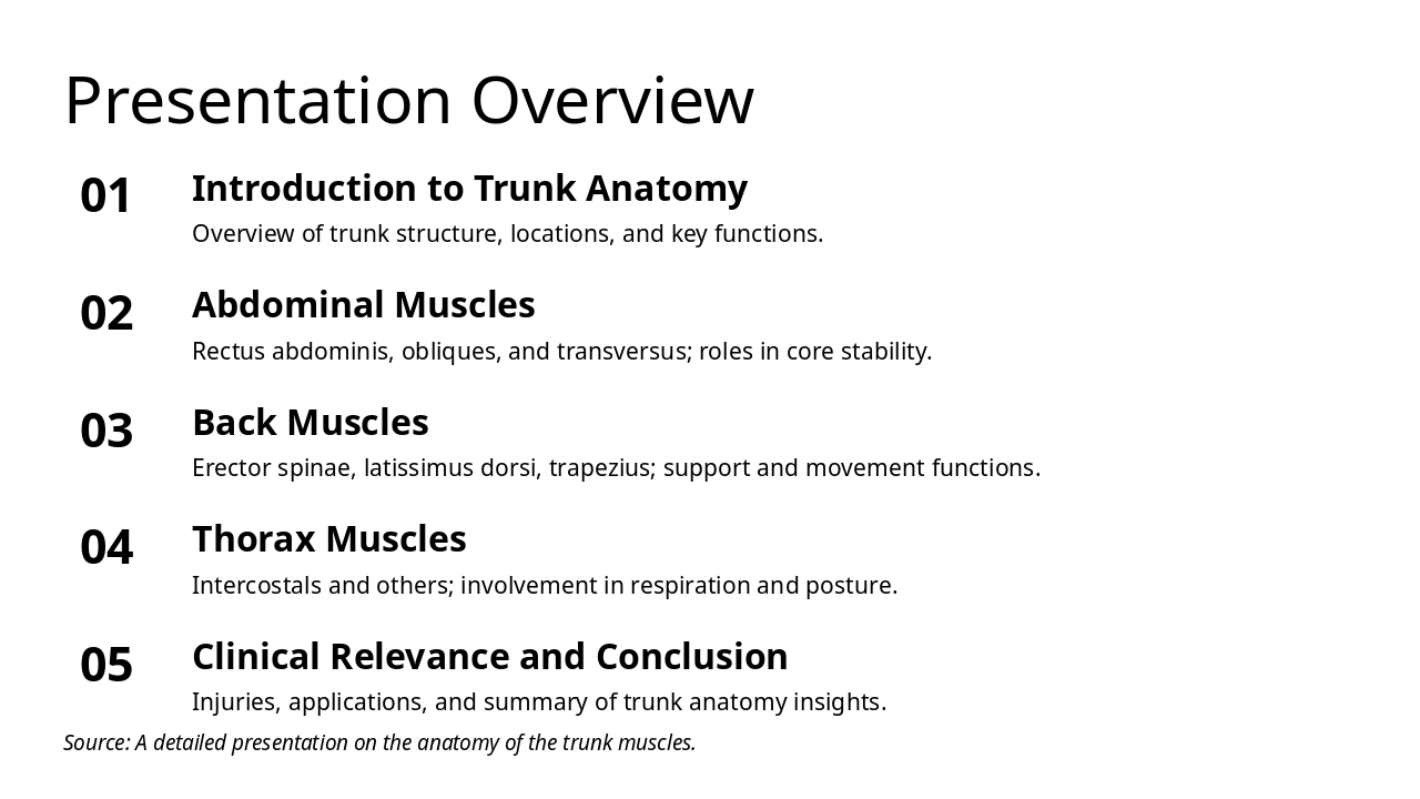 The Presentation Overview slide outlines the agenda for a trunk anatomy discussion, starting with an introduction to the trunk's structure, locations, and key functions. It then covers abdominal muscles for core stability, back muscles for support and movement, thorax muscles for respiration and posture, and ends with clinical relevance, injuries, applications, and a conclusion.