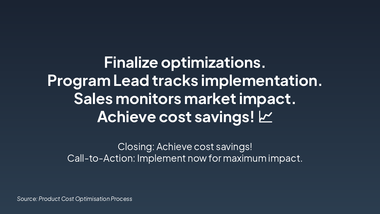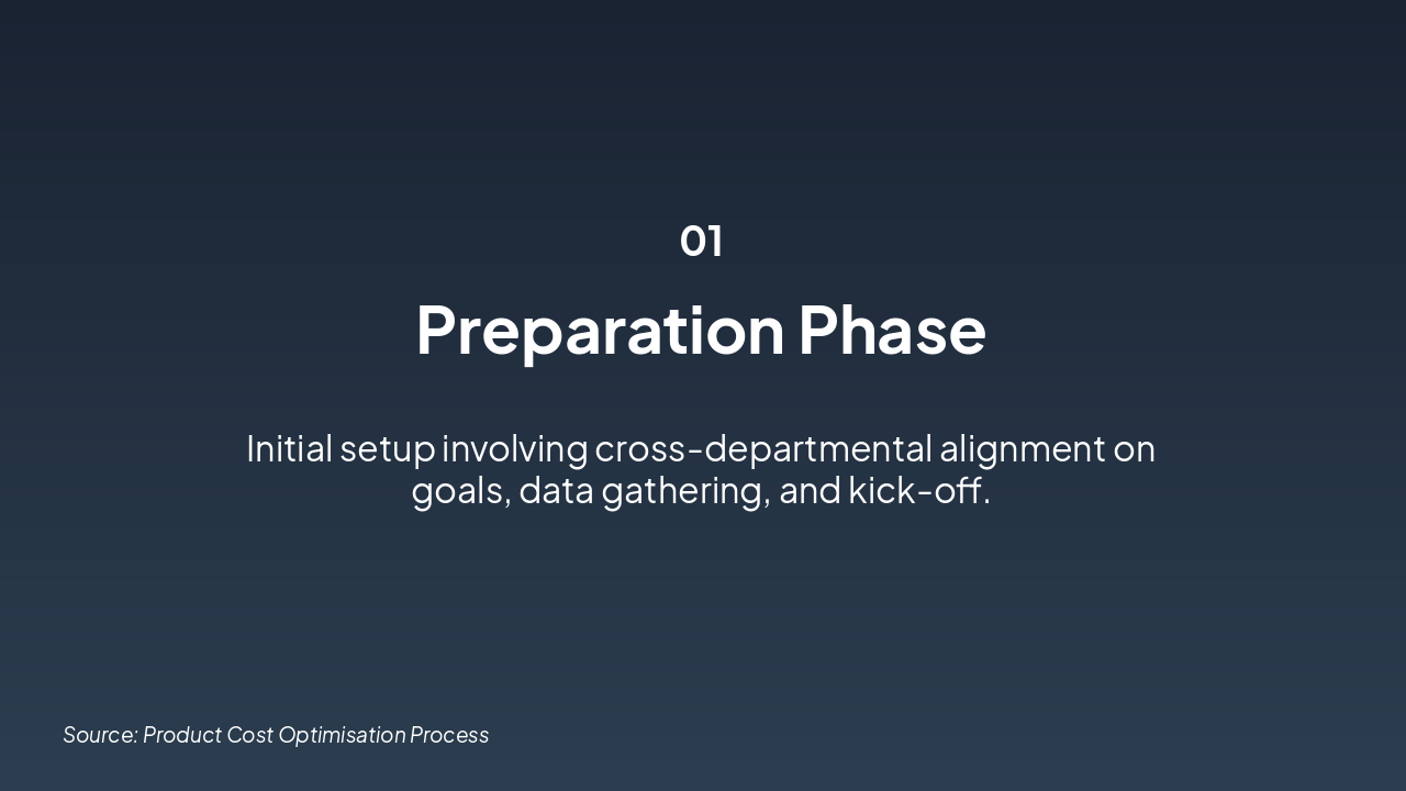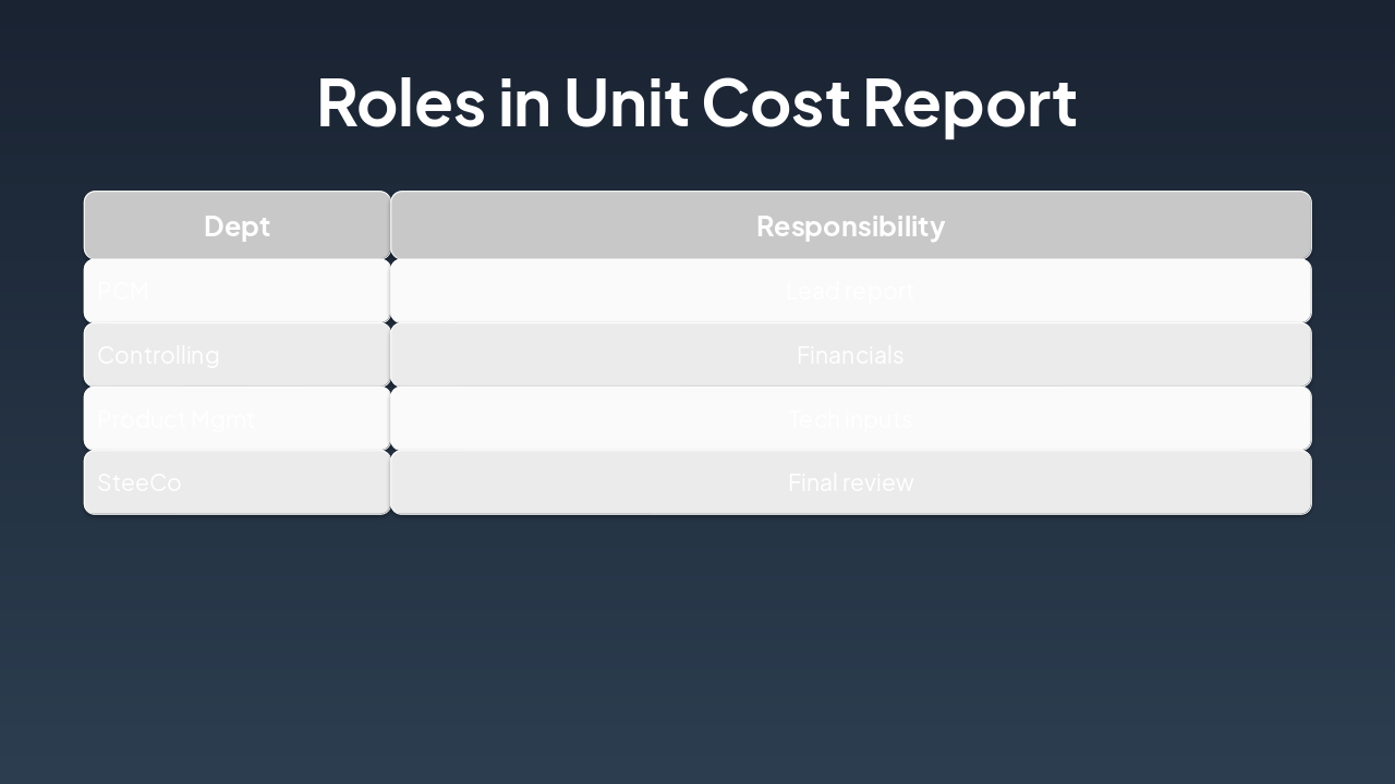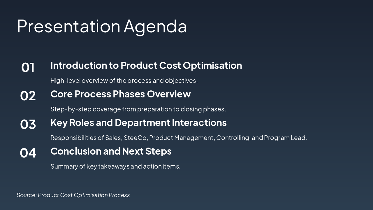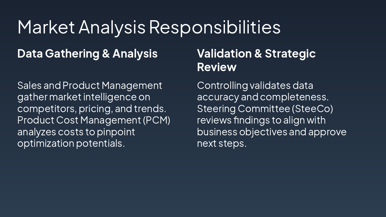 { "headers": [ "Phase", "Key Interactions", "Owner/Approver" ], "rows": [ [ "Preparation", "Program Lead initiates process and gathers initial data", "Program Lead of Product Cost Optimisation" ], [ "Market Analysis", "Sales provides market data to PCM", "Sales → Product Cost Management (PCM)" ], [ "Report Creation", "Inputs from all departments (Sales, Product Management, Controlling, PCM)", "All Departments" ], [ "Closing", "Final report reviewed and approved", "SteeCo (Steering Committee)" ] ] }