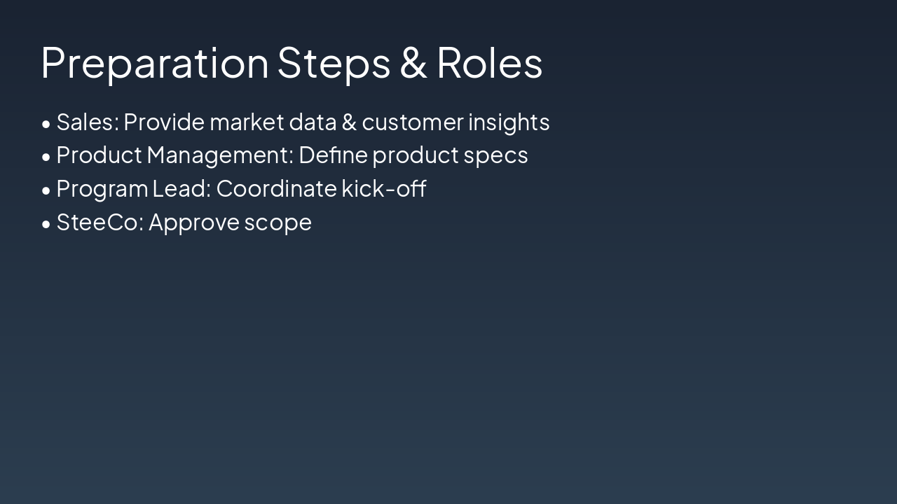 The slide outlines a workflow for Process Interactions across four phases: Preparation (initiated by Program Lead), Market Analysis (Sales to PCM), Report Creation (inputs from all departments), and Closing (approved by Steering Committee). Each phase lists key interactions and the responsible owner or approver.