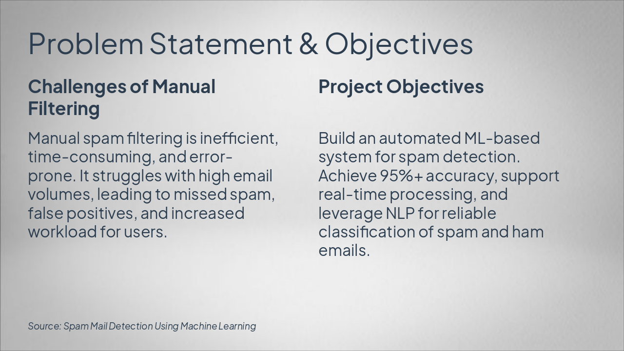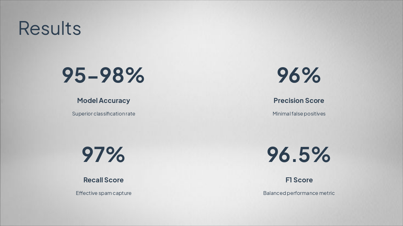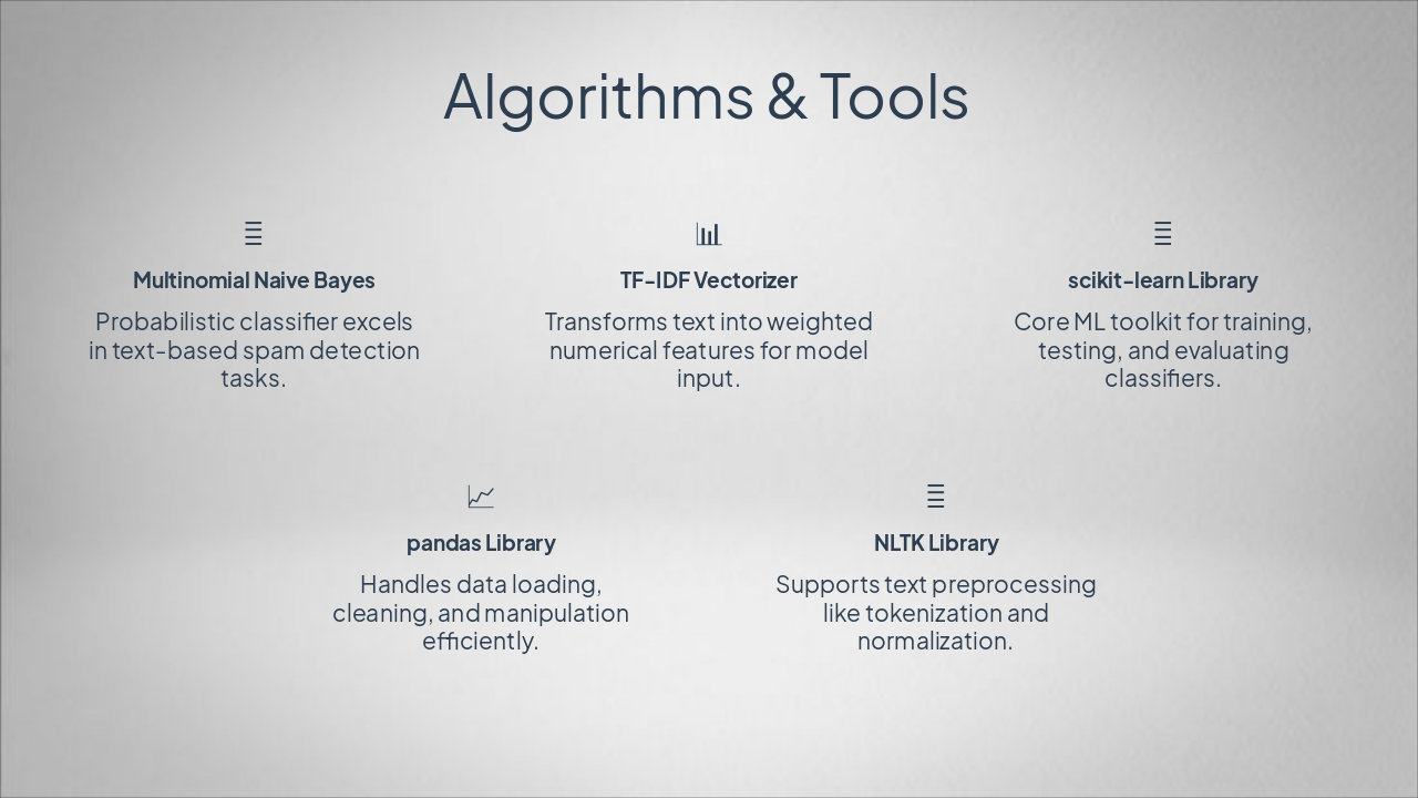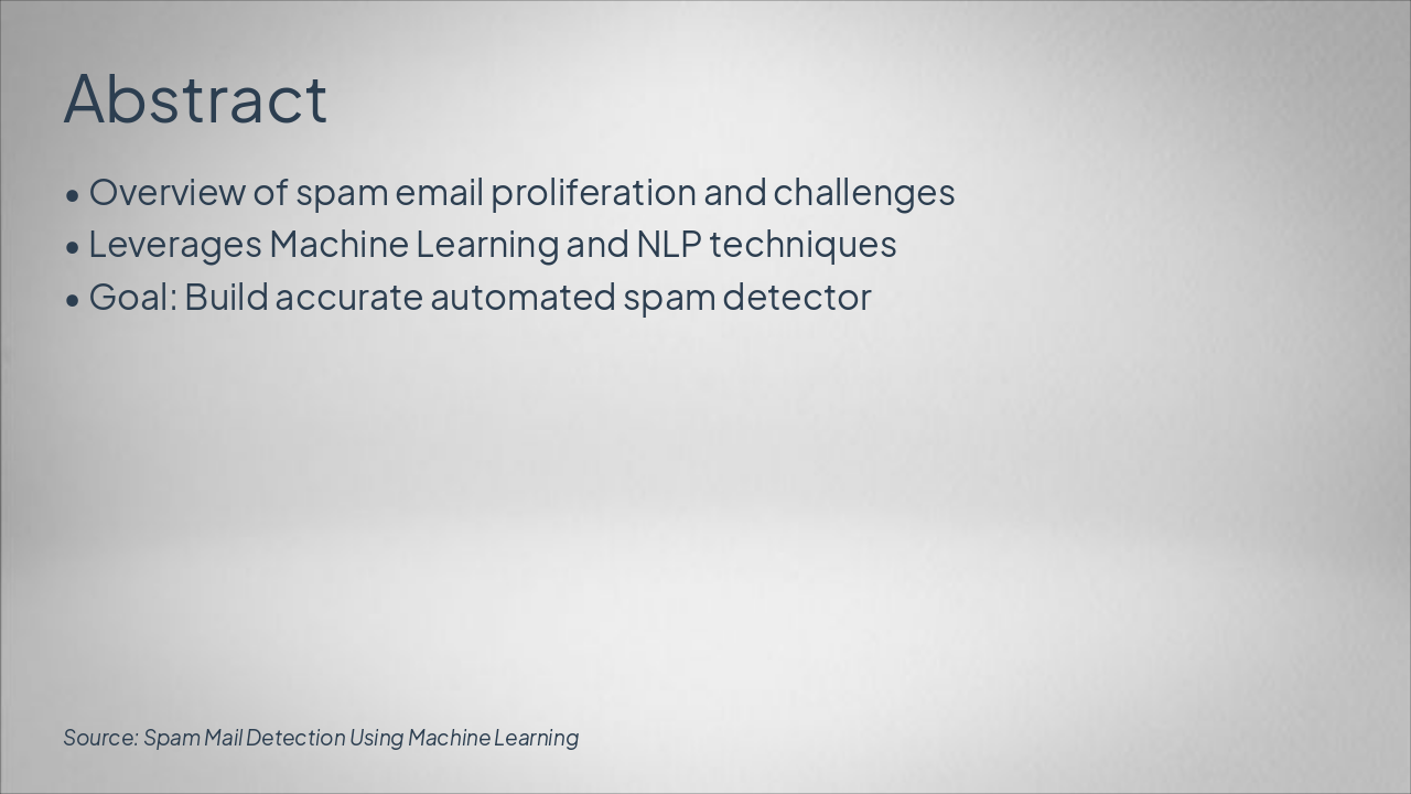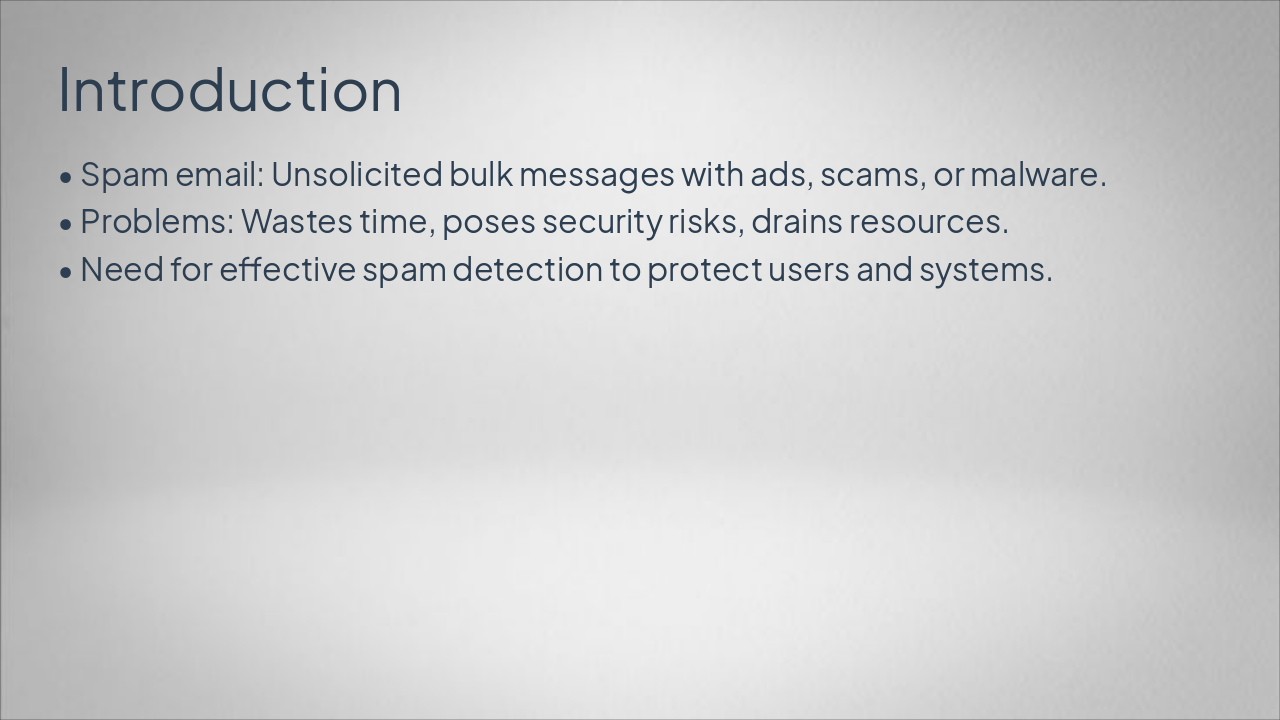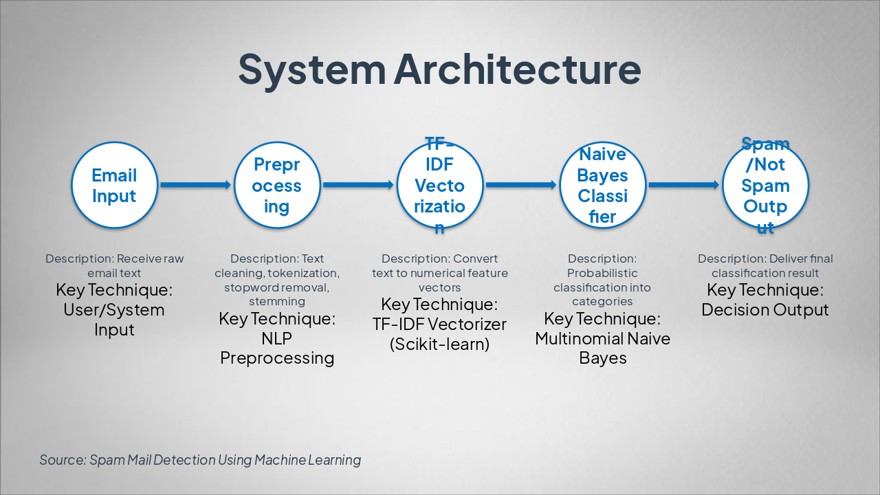 { "headers": [ "Phase", "Description", "Key Techniques" ], "rows": [ [ "Data Collection", "Gather spam (5,723) and ham (13,279) emails", "GitHub Enron Dataset download" ], [ "Text Preprocessing", "Clean text: lowercasing, remove stopwords, punctuation, stemming", "Python NLTK, scikit-learn" ], [ "Feature Extraction", "Convert text to numerical vectors", "TF-IDF Vectorizer" ], [ "Model Training", "Train classifier on labeled data", "Multinomial Naive Bayes" ], [ "Testing", "Evaluate on test set", "Accuracy, Precision, Recall, F1-Score (~95-98%)" ] ] }