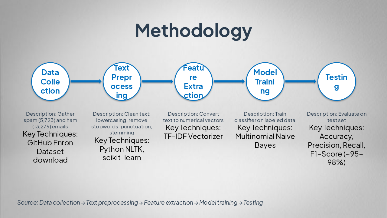 Walk through the sequential steps of the methodology, emphasizing how each phase builds on the previous one for effective spam detection. Keep explanations simple and highlight key techniques.