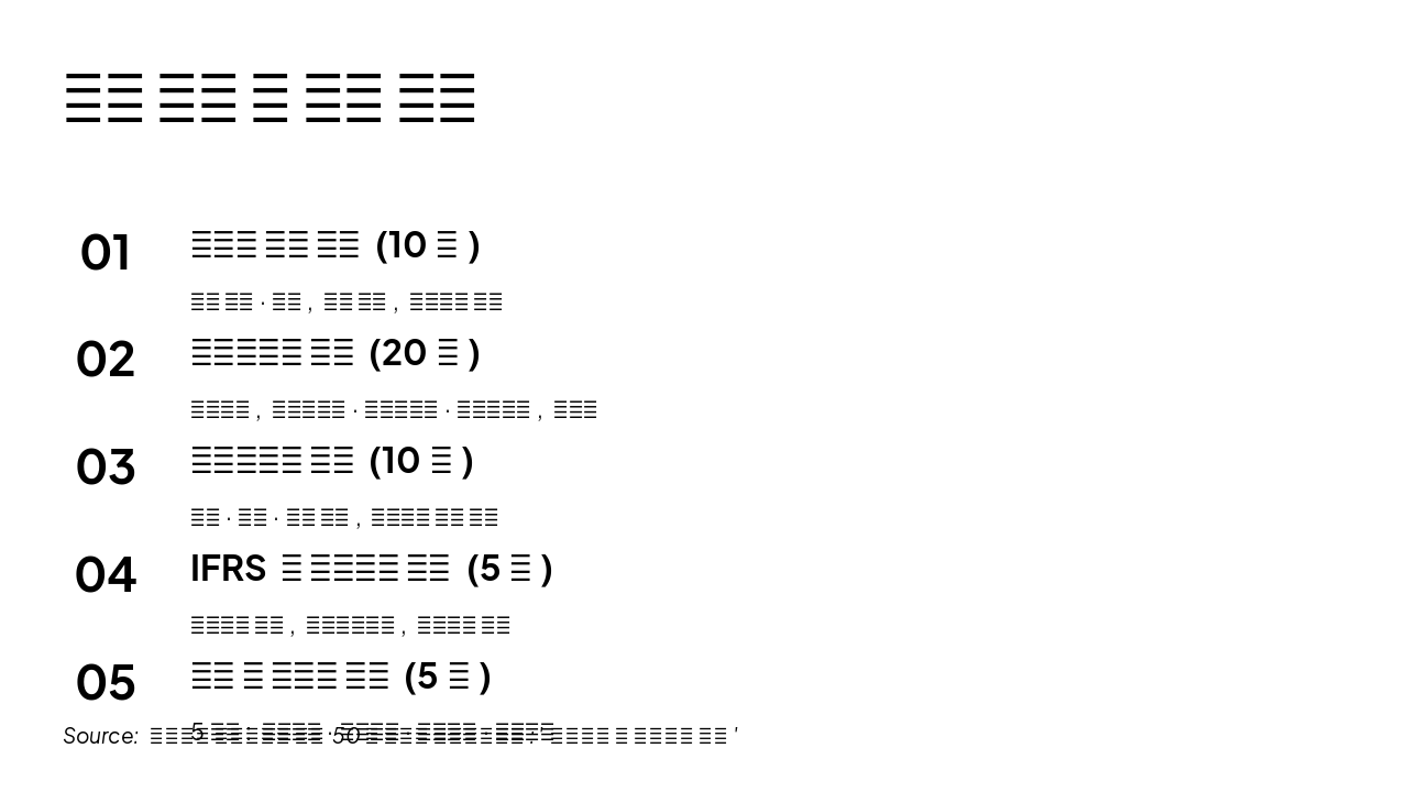 { "headers": [ "번호", "질문", "정답" ], "rows": [ [ "1", "복식부기 차변?", "자산증가" ], [ "2", "재무상태표 자산=?", "부채+자본" ], [ "3", "수직분석?", "비중" ], [ "4", "IFRS 공정가치?", "시장가" ], [ "5", "현금흐름표 분류?", "영업/투자/재무" ] ] }