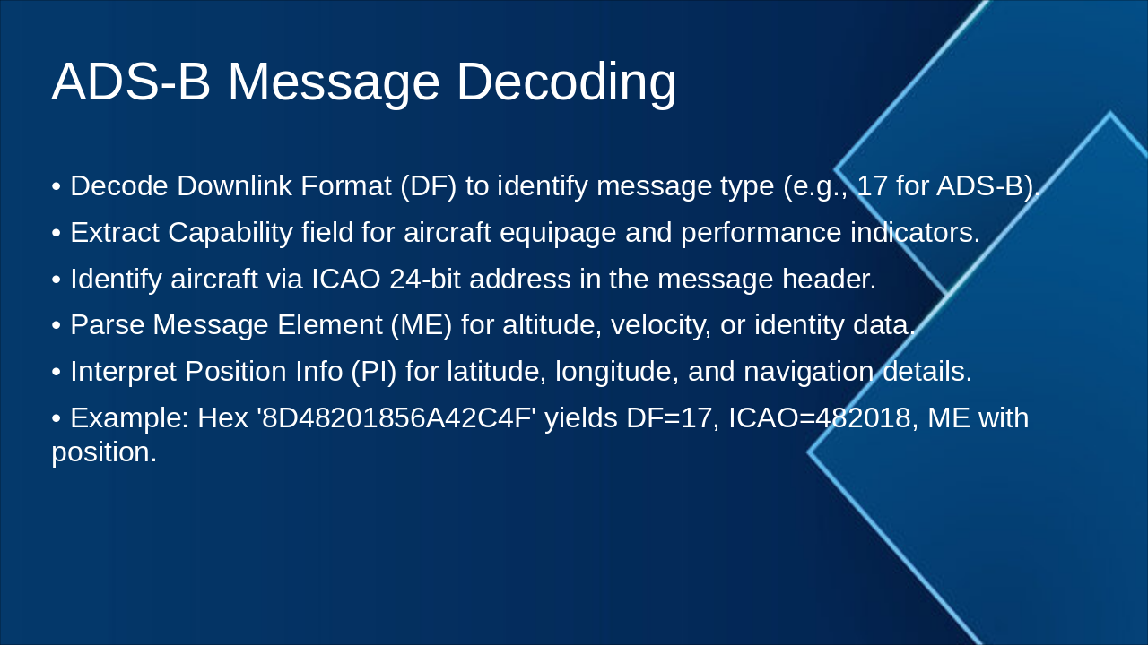 Explanation of decoding ADS-B messages including DF, Capability, ICAO, ME, and PI fields.