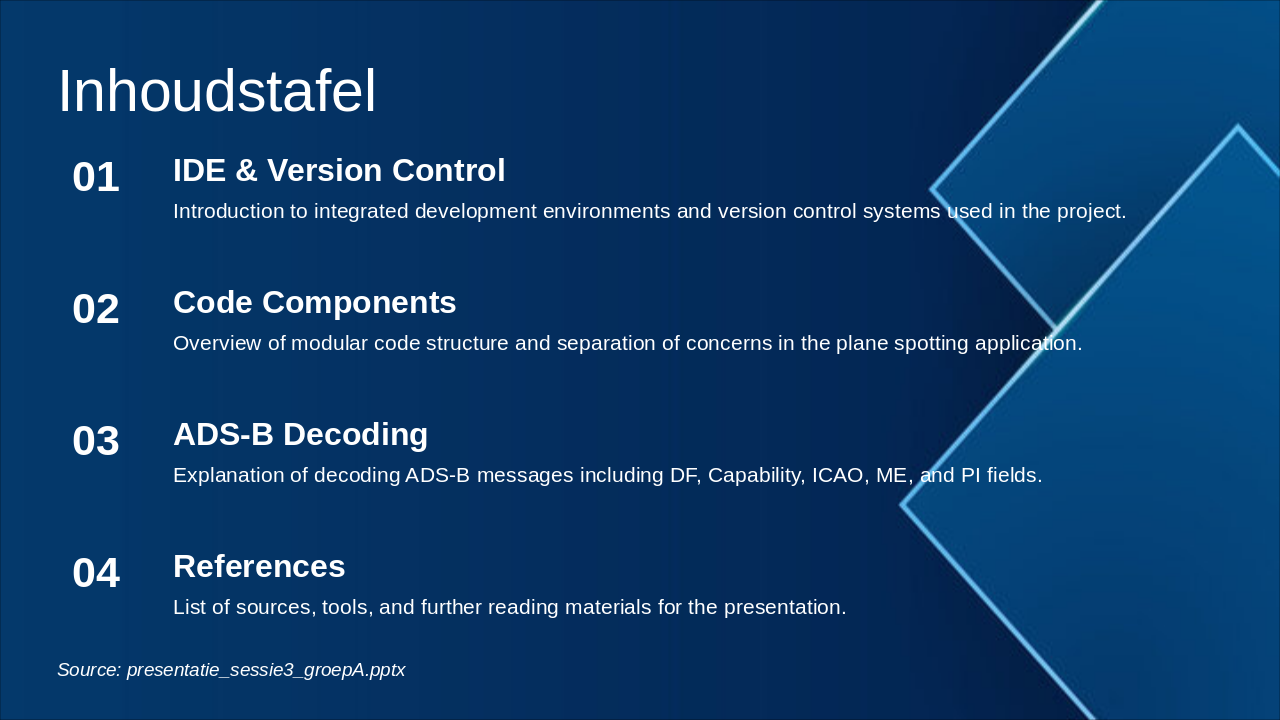 The agenda slide, titled "Inhoudstafel," outlines the key sections of a presentation on a plane spotting application. It covers IDE and version control for project development, modular code components with separation of concerns, ADS-B message decoding including fields like DF, Capability, ICAO, ME, and PI, and a list of references for sources and further reading.