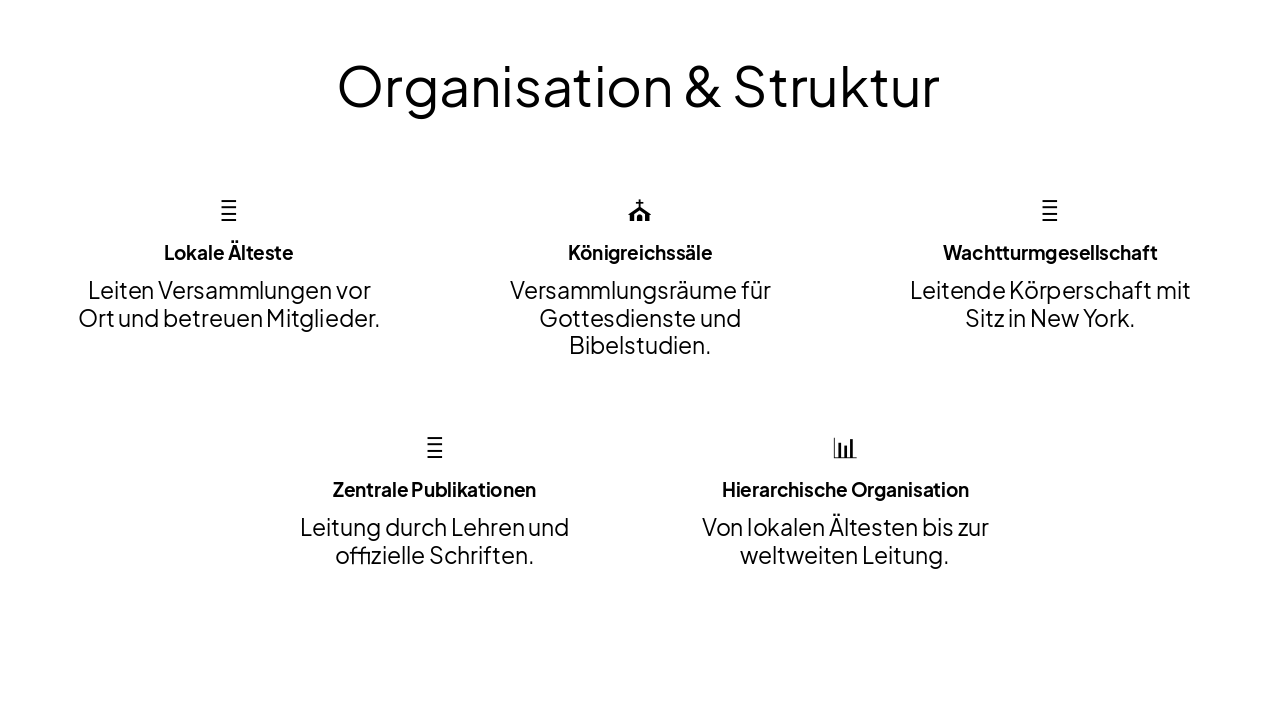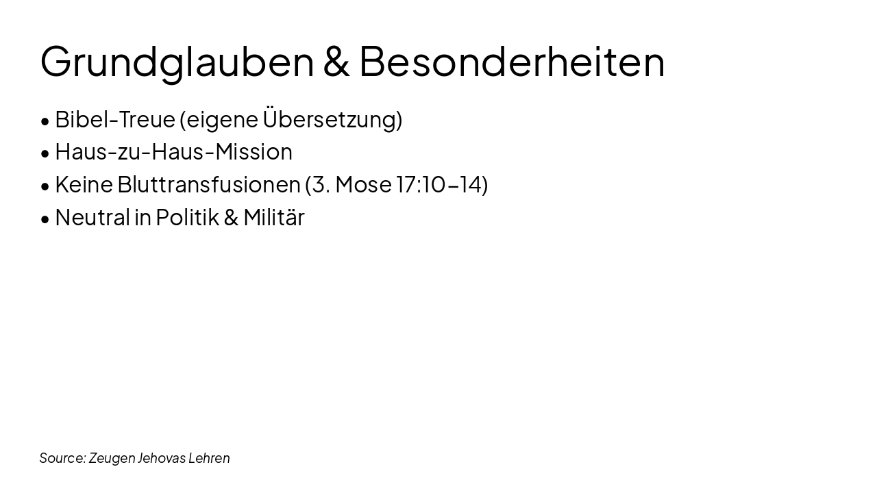 { "headers": [ "Phase", "Beschreibung", "Dauer" ], "rows": [ [ "Bibelstudium", "Studium der Bibel mit Jehovas Zeugen", "Variabel" ], [ "Taufunterricht", "Strukturierter Unterricht zur Vorbereitung", "ca. 1 Jahr" ], [ "Taufe", "Vollständiges Untertauchen im Wasser", "Ein Tag" ], [ "Verpflichtung", "Gelebte Hingabe an Regeln und Verkündigungsdienst", "Lebenslang" ] ] }