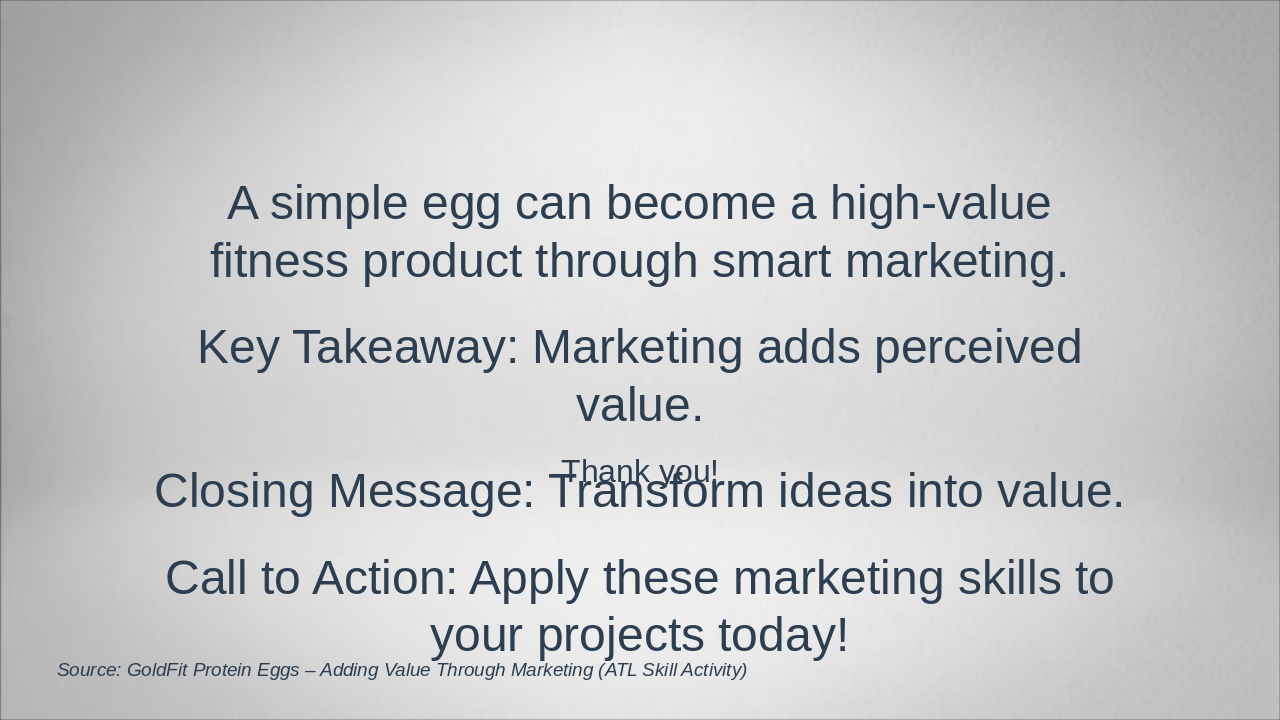 The slide's title is "GoldFit Protein Eggs – Adding Value Through Marketing," highlighting a focus on enhancing product value via marketing strategies. It is presented as an ATL Skill Activity, with the subtitle reinforcing this educational or skill-building purpose.