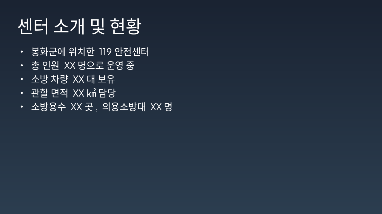 봉화군에 위치한 119안전센터는 총 XX명으로 운영되며 XX대의 소방차량을 보유하고 있습니다. 관할 면적 XX㎢를 담당하며 소방용수 XX곳과 의용소방대 XX명을 운영 중입니다.