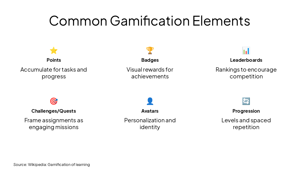Structural Gamification Game-like features added to traditional activities Core content unchanged, elements layered on top Examples: Kahoot! quizzes, badges for Google Forms assessments