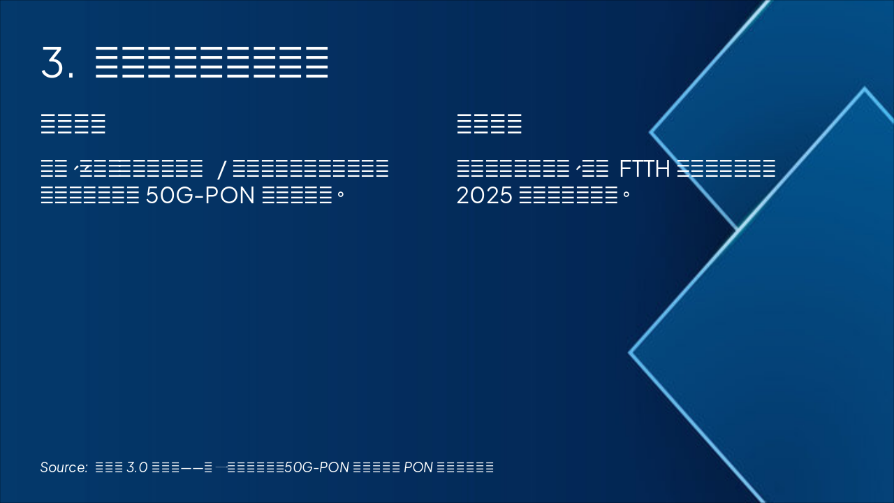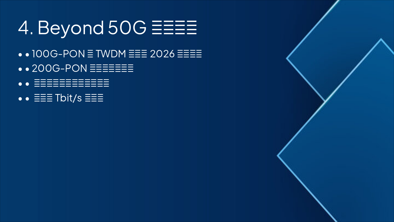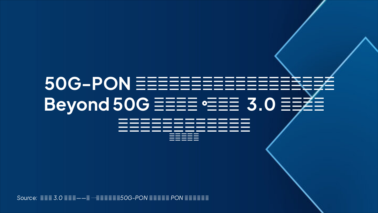 The slide positions 50G-PON with a symmetric 50Gbps rate enabling full-duplex upload/download. It delivers 5x bandwidth density growth over the prior generation, 30% lower O&M costs, and capacity for 100,000 users per OLT.