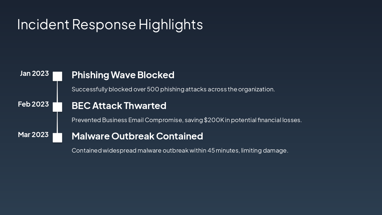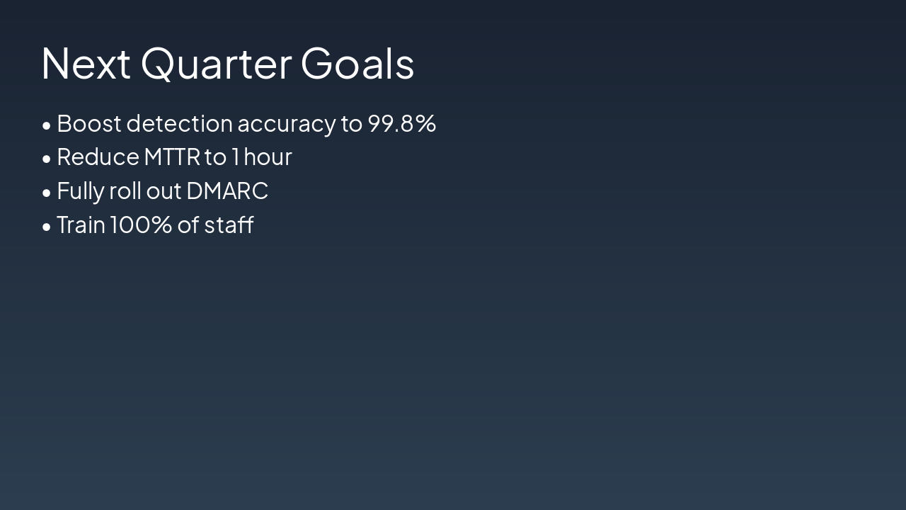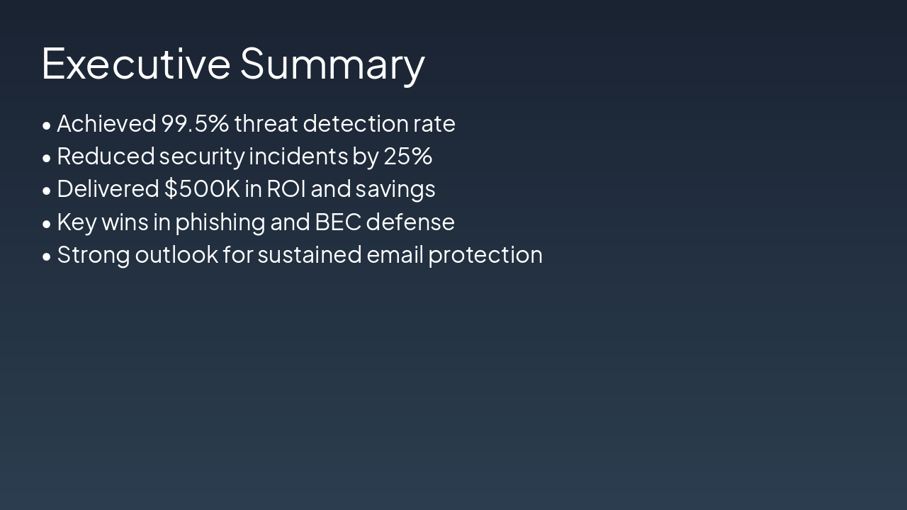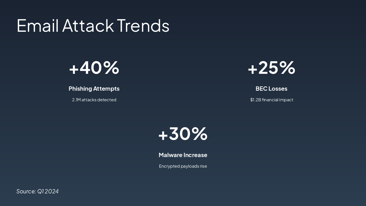{ "features": [ { "icon": "๐ค", "heading": "AI Filtering Upgrade", "description": "Advanced AI detects sophisticated phishing attacks with 99% accuracy, minimizing false positives." }, { "icon": "๐", "heading": "Zero-Trust MFA", "description": "Zero-trust architecture with MFA secures all email access, eliminating credential-based breaches." }, { "icon": "๐", "heading": "Training Modules", "description": "Interactive employee training reduced phishing click rates by 40% in Q3." }, { "icon": "๐งช", "heading": "Sandbox Enhancements", "description": "Upgraded sandbox safely detonates attachments, preventing zero-day malware infections." }, { "icon": "๐", "heading": "Real-time Analytics", "description": "Live dashboards provide instant threat visibility and performance insights." } ] }