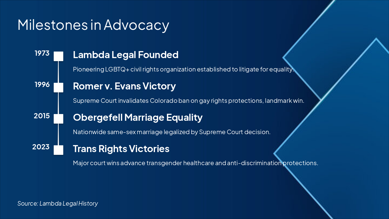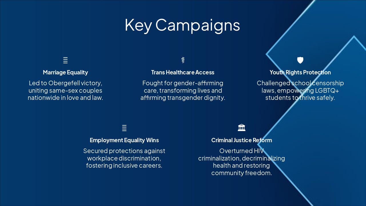 { "features": [ { "icon": "💍", "heading": "Marriage Equality", "description": "Led to Obergefell victory, uniting same-sex couples nationwide in love and law." }, { "icon": "⚕️", "heading": "Trans Healthcare Access", "description": "Fought for gender-affirming care, transforming lives and affirming transgender dignity." }, { "icon": "🛡️", "heading": "Youth Rights Protection", "description": "Challenged school censorship laws, empowering LGBTQ+ students to thrive safely." }, { "icon": "💼", "heading": "Employment Equality Wins", "description": "Secured protections against workplace discrimination, fostering inclusive careers." }, { "icon": "🏛️", "heading": "Criminal Justice Reform", "description": "Overturned HIV criminalization, decriminalizing health and restoring community freedom." } ] }