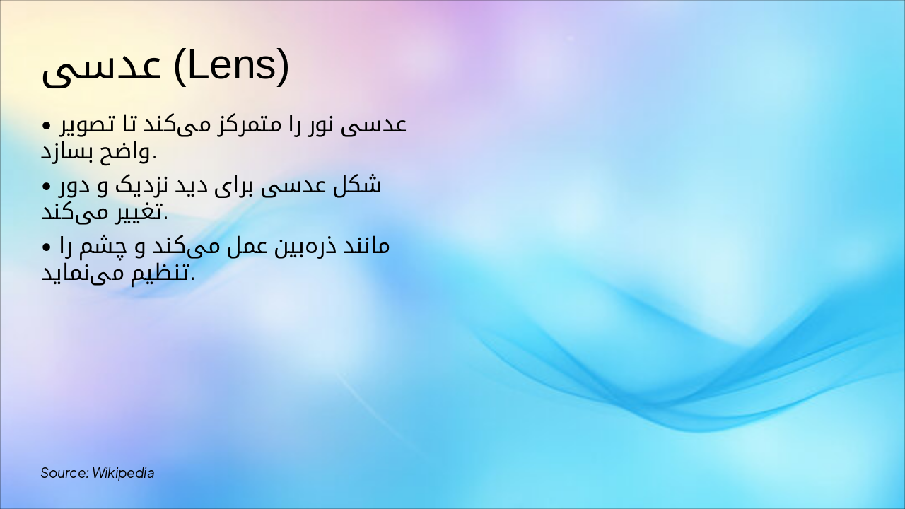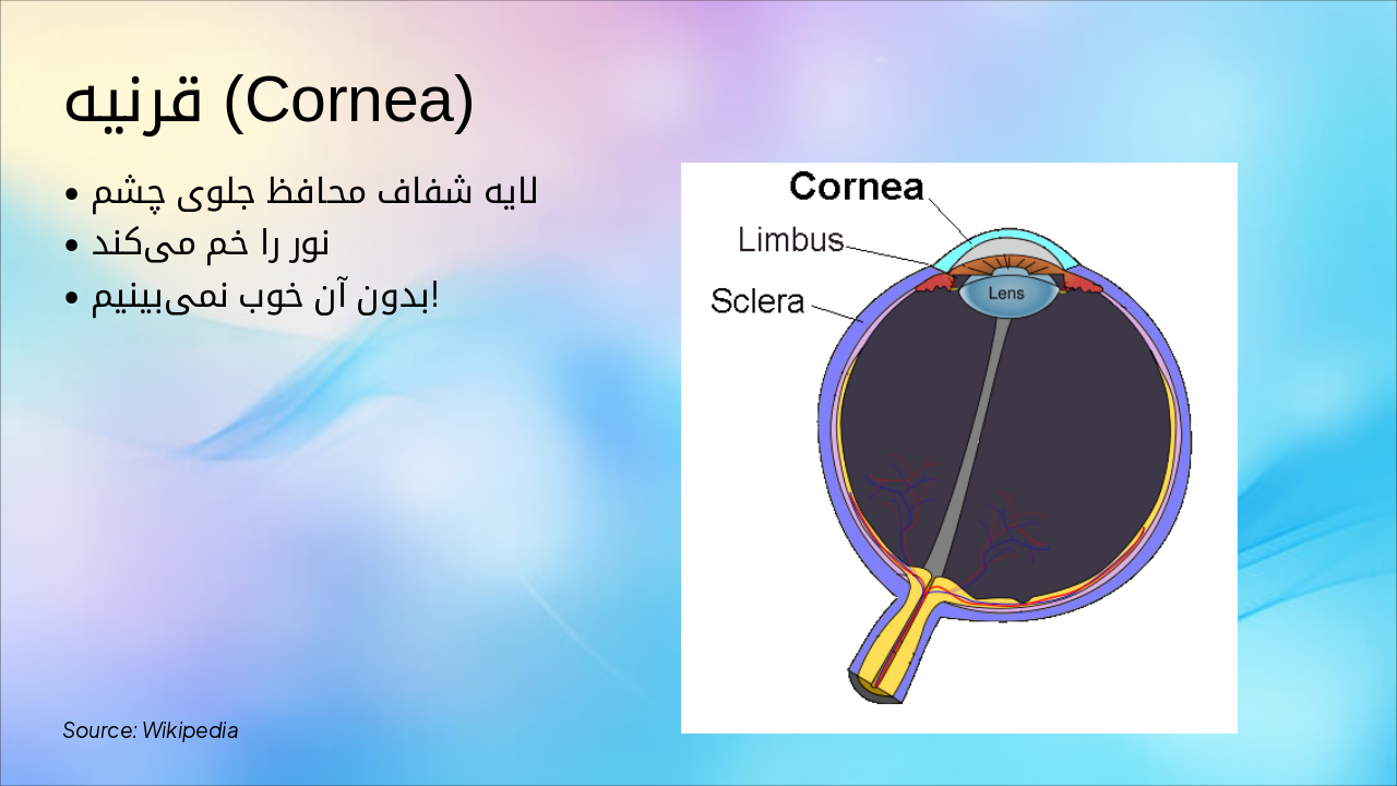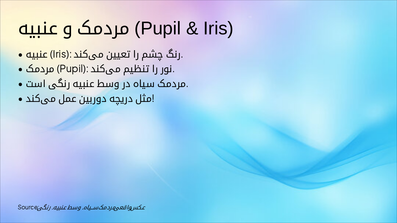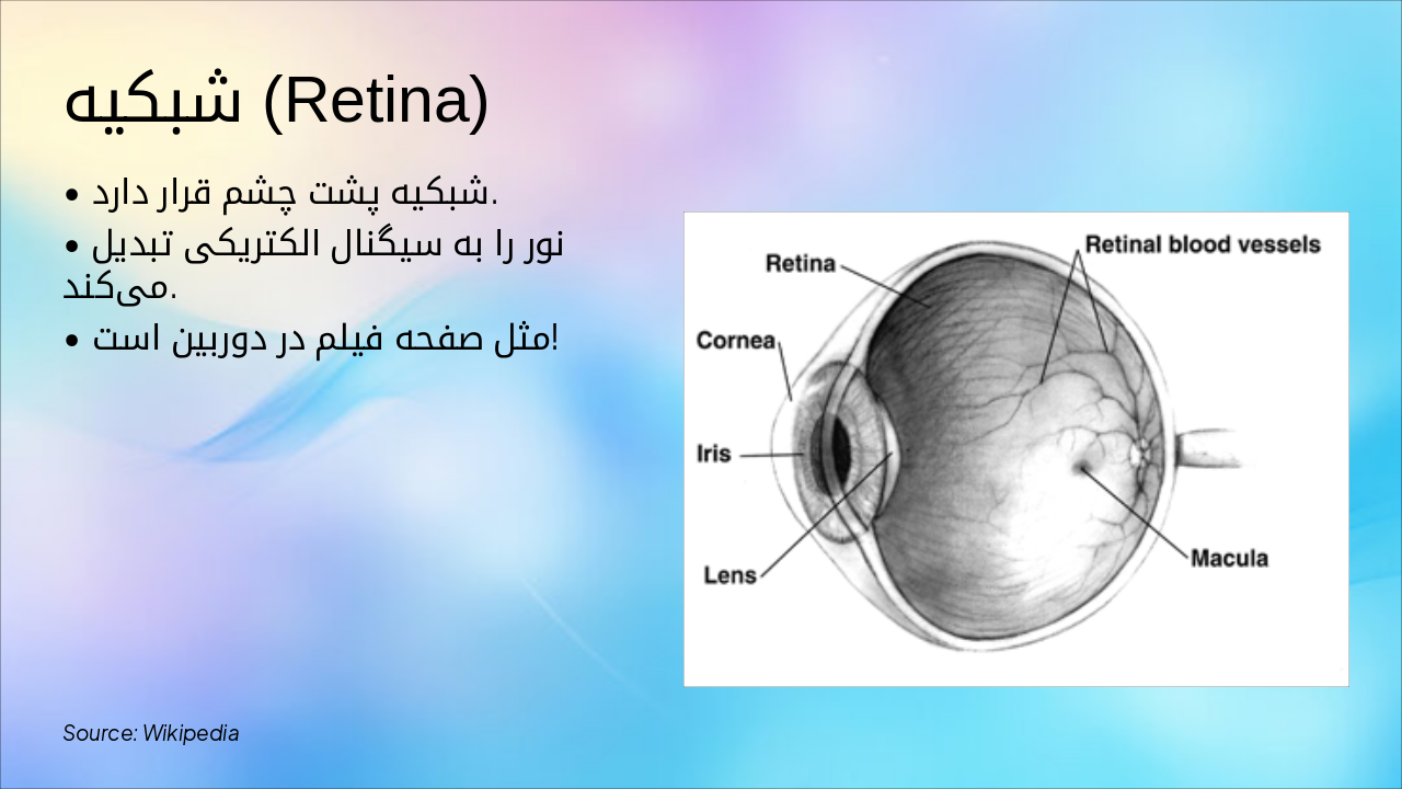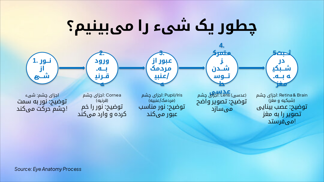 نور از شیء → قرنیه → مردمک/عنبیه → عدسی → شبکیه → عصب بینایی → مغز. تصویر کامل میشود! See the magic!