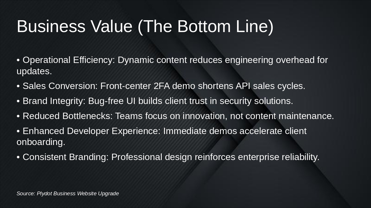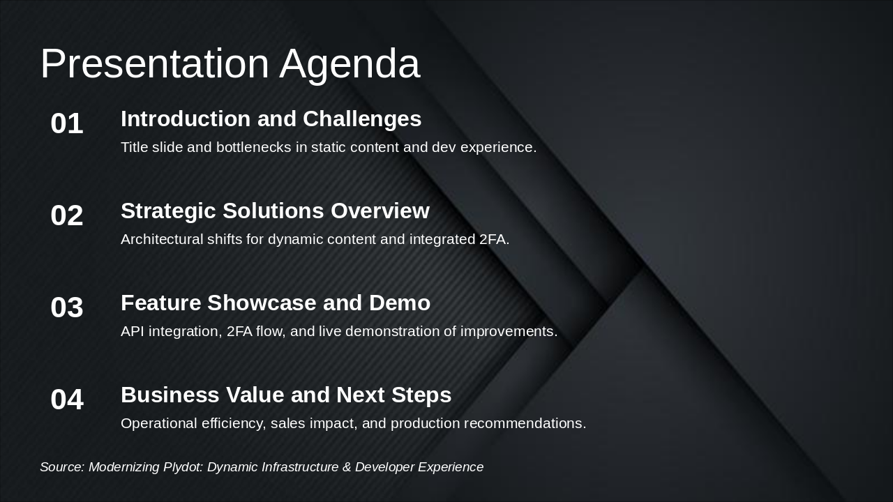 The Presentation Agenda slide outlines a structured overview of the talk, starting with an Introduction and Challenges section that covers the title slide and bottlenecks in static content and developer experience. It proceeds to Strategic Solutions Overview for architectural shifts enabling dynamic content and integrated 2FA, followed by a Feature Showcase and Demo highlighting API integration, 2FA flow, and live improvements, and concludes with Business Value and Next Steps on operational efficiency, sales impact, and production recommendations.