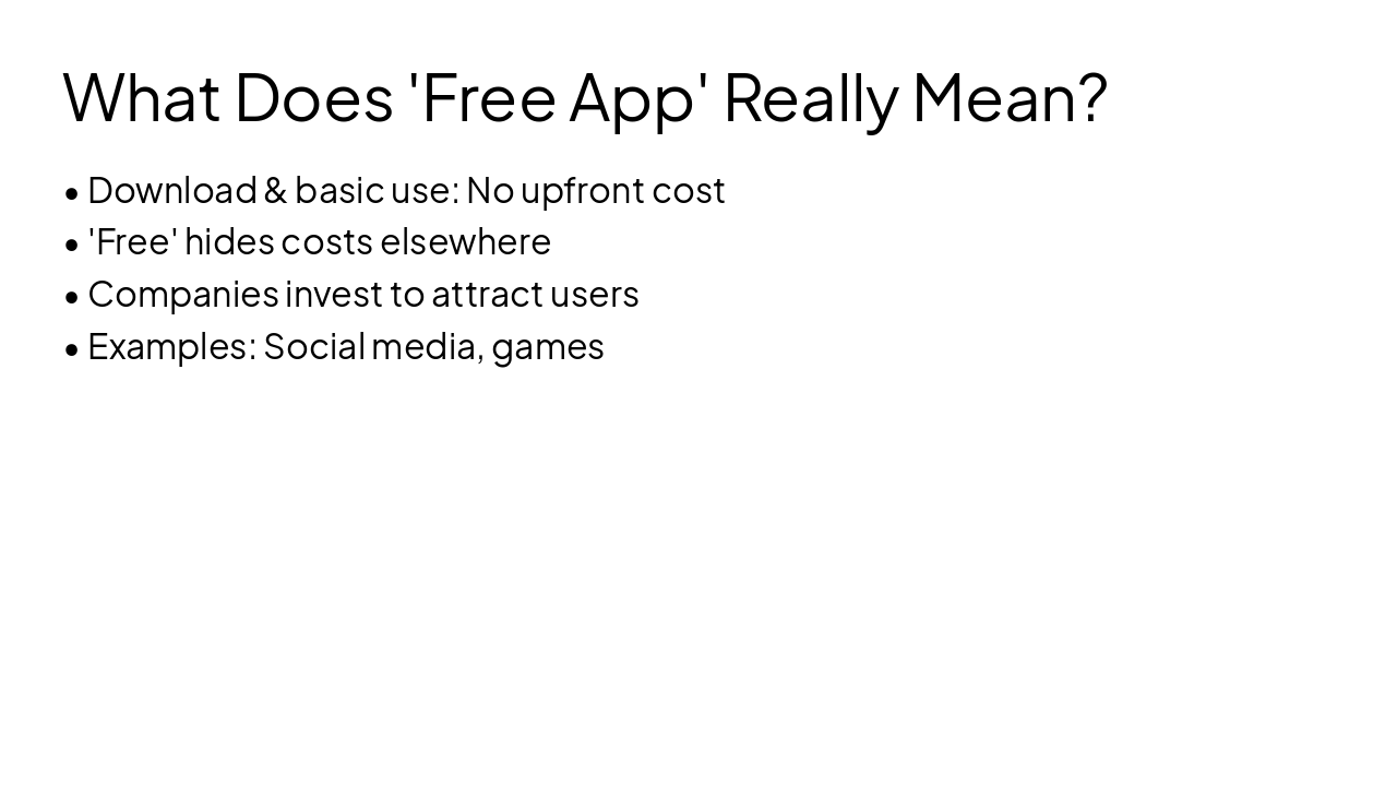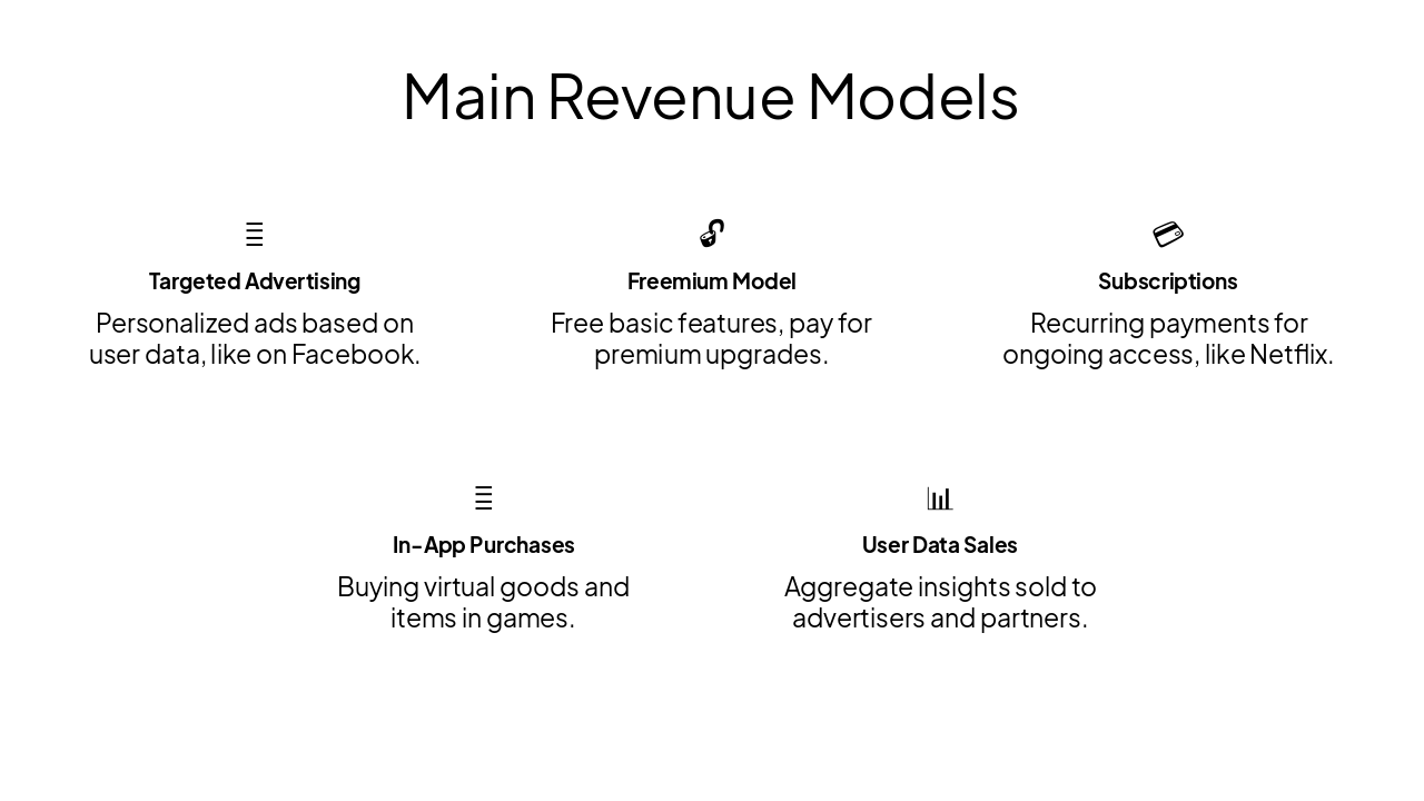 { "features": [ { "icon": "🎯", "heading": "Targeted Advertising", "description": "Personalized ads based on user data, like on Facebook." }, { "icon": "🔓", "heading": "Freemium Model", "description": "Free basic features, pay for premium upgrades." }, { "icon": "💳", "heading": "Subscriptions", "description": "Recurring payments for ongoing access, like Netflix." }, { "icon": "🛒", "heading": "In-App Purchases", "description": "Buying virtual goods and items in games." }, { "icon": "📊", "heading": "User Data Sales", "description": "Aggregate insights sold to advertisers and partners." } ] }