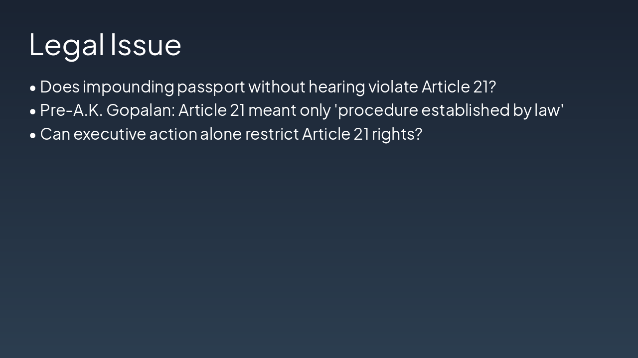 { "headers": [ "Phase", "Key Development" ], "rows": [ [ "Passport Impounded", "Government impounds passport without hearing" ], [ "Petition Filed", "Maneka files writ petition under Article 226" ], [ "Legal Debate", "Court debates 'procedure established by law' vs. due process" ], [ "Judgment", "SC holds procedure must be fair, just, reasonable" ], [ "Expansion of Article 21", "Art. 21 interlinked with Arts. 14 & 19 forming 'Golden Triangle'" ] ] }