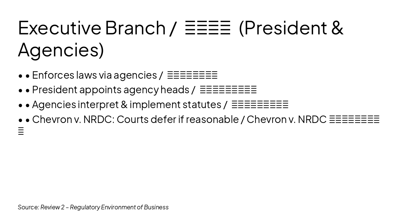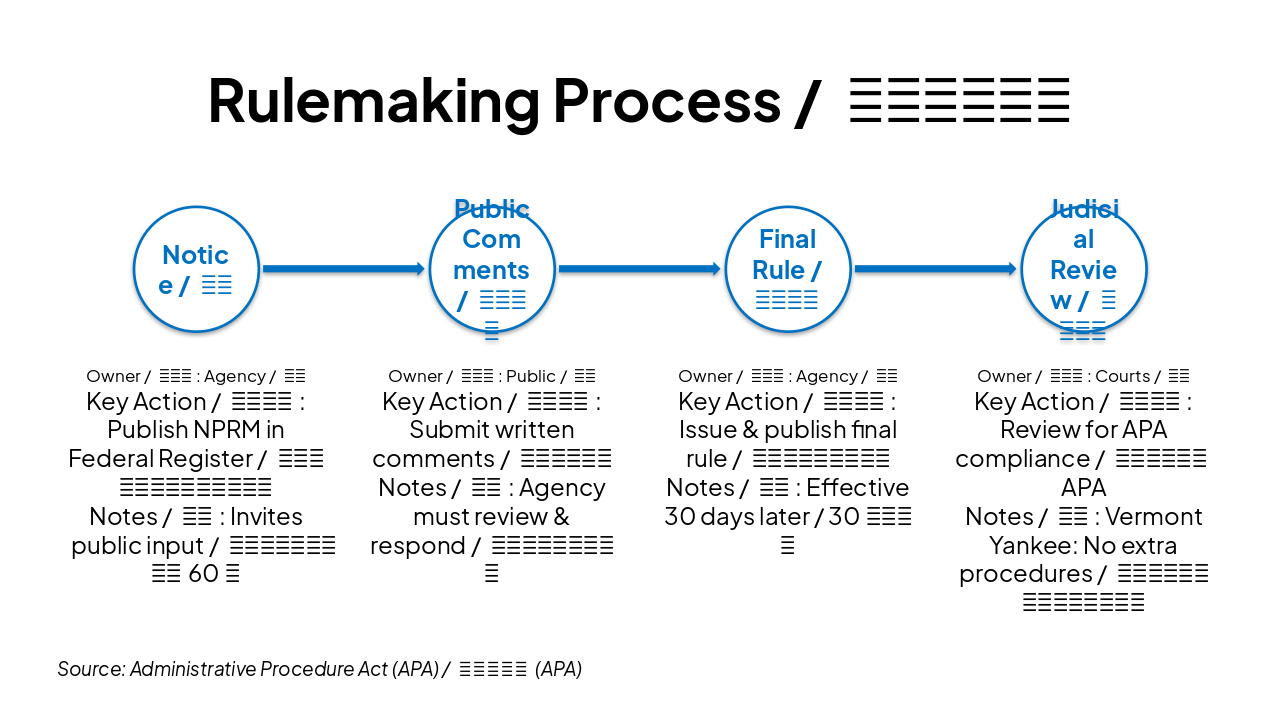 { "headers": [ "Step / 步骤", "Owner / 负责人", "Key Action / 关键行动", "Notes / 备注" ], "rows": [ [ "Notice / 通知", "Agency / 机构", "Publish NPRM in Federal Register / 在联邦公报发布拟议规则通知", "Invites public input / 邀请公众意见,通常60天" ], [ "Public Comments / 公众评论", "Public / 公众", "Submit written comments / 提交书面评论", "Agency must review & respond / 机构必须审查并回应" ], [ "Final Rule / 最终规则", "Agency / 机构", "Issue & publish final rule / 颁布并发布最终规则", "Effective 30 days later / 30天后生效" ], [ "Judicial Review / 司法审查", "Courts / 法院", "Review for APA compliance / 审查是否符合APA", "Vermont Yankee: No extra procedures / 佛蒙特扬基:法院不能增加程序" ] ] }